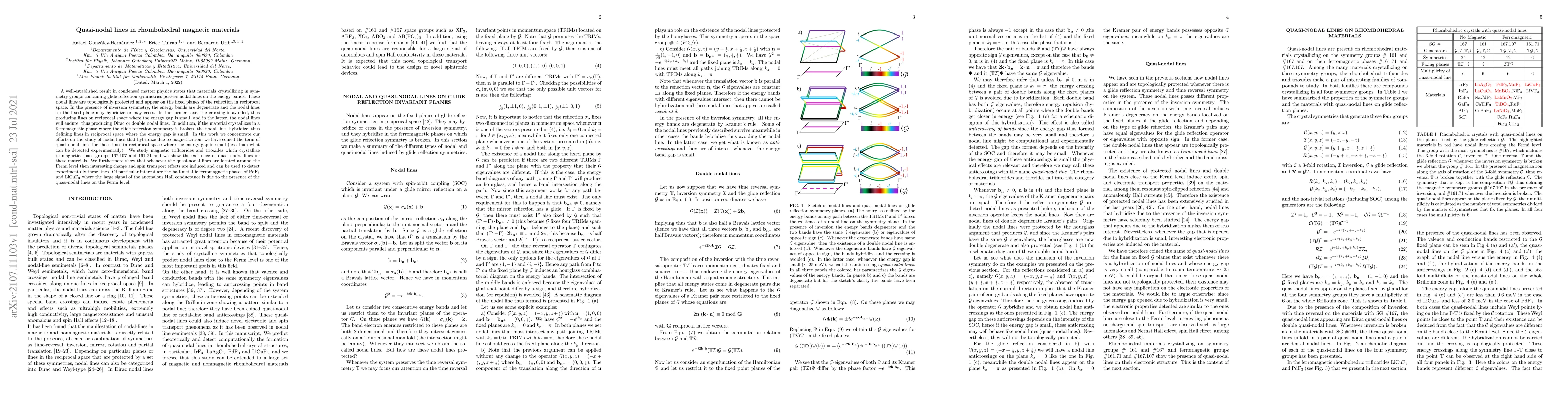 A well-established result in condensed matter physics states that materials crystallizing in symmetry groups containing glide reflection symmetries possess nodal lines on the energy bands. These nodal lines are topologically protected and appear on the fixed planes of the reflection in reciprocal space. In the presence of inversion symmetry, the energy bands are degenerate and the nodal lines on the fixed plane may hybridize or may cross. In the former case, the crossing is avoided, thus producing lines on reciprocal space where the energy gap is small, and in the latter, the nodal lines will endure, thus producing Dirac or double nodal lines. In addition, if the material crystallizes in a ferromagnetic phase where the glide reflection symmetry is broken, the nodal lines hybridize, thus defining lines in reciprocal space where the energy gap is small. In this work we concentrate our efforts on the study of nodal lines that hybridize due to magnetization; we have coined the term of quasi-nodal lines for those lines in reciprocal space where the energy gap is small (less than what can be detected experimentally). We study magnetic trifluorides and trioxides which crystallize in magnetic space groups 167.107 and 161.71 and we show the existence of quasi-nodal lines on these materials. We furthermore show that whenever the quasi-nodal lines are located around the Fermi level then interesting charge and spin transport effects are induced and can be used to detect experimentally these lines. Of particular interest are the half-metallic ferromagnetic phases of PdF3 and LiCuF3 where the large signal of the anomalous Hall conductance is due to the presence of the quasi-nodal lines on the Fermi level.