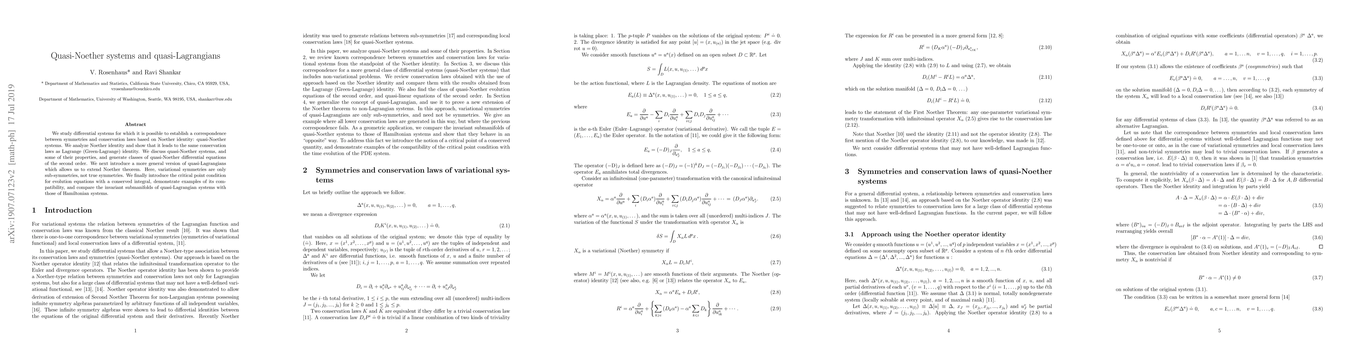 We study differential systems for which it is possible to establish a correspondence between symmetries and conservation laws based on Noether identity: quasi-Noether systems. We analyze Noether identity and show that it leads to the same conservation laws as Lagrange (Green-Lagrange) identity. We discuss quasi-Noether systems, and some of their properties, and generate classes of quasi-Noether differential equations of the second order. We next introduce a more general version of quasi-Lagrangians which allows us to extend Noether theorem. Here, variational symmetries are only sub-symmetries, not true symmetries. We finally introduce the critical point condition for evolution equations with a conserved integral, demonstrate examples of its compatibility, and compare the invariant submanifolds of quasi-Lagrangian systems with those of Hamiltonian systems.