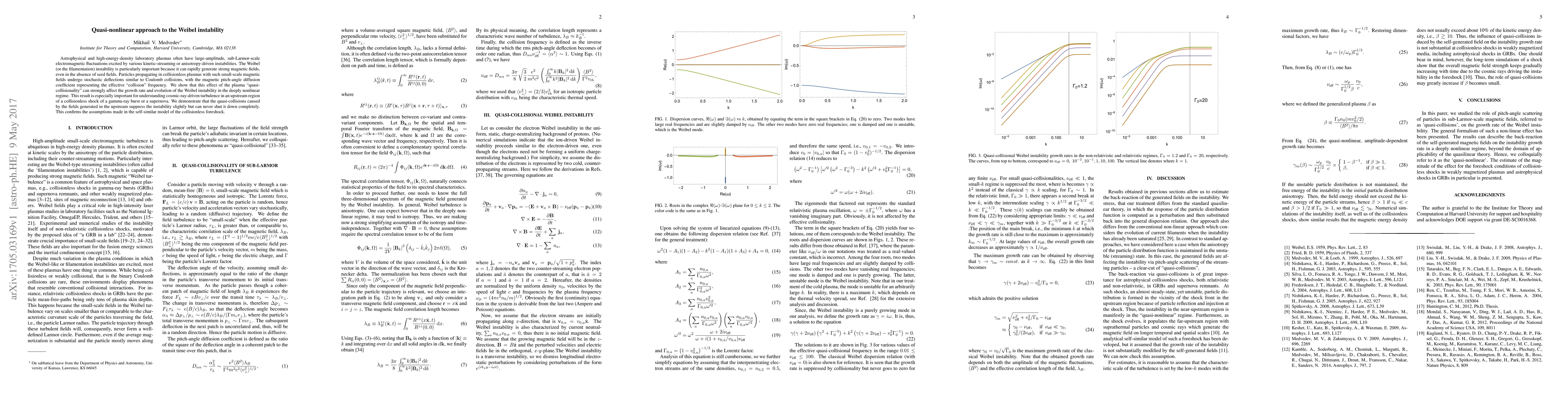 This paper explores the quasi-nonlinear dynamics of the Weibel instability, demonstrating that magnetic fields generated by the instability can induce quasi-collisional effects in plasma, slightly suppressing but not fully halting the instability's growth. This insight is crucial for understanding turbulence driven by cosmic rays in the foreshock regions of astrophysical phenomena.