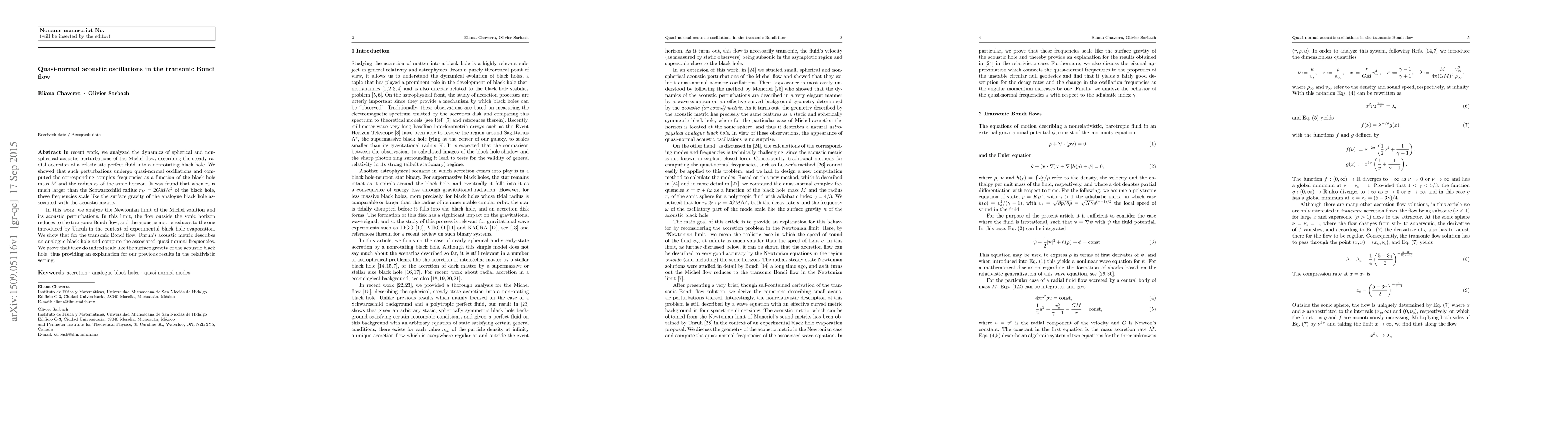 In recent work, we analyzed the dynamics of spherical and nonspherical acoustic perturbations of the Michel flow, describing the steady radial accretion of a relativistic perfect fluid into a nonrotating black hole. We showed that such perturbations undergo quasi-normal oscillations and computed the corresponding complex frequencies as a function of the black hole mass M and the radius r_c of the sonic horizon. It was found that when r_c is much larger than the Schwarzschild radius r_H = 2GM/c^2 of the black hole, these frequencies scale like the surface gravity of the analogue black hole associated with the acoustic metric. In this work, we analyze the Newtonian limit of the Michel solution and its acoustic perturbations. In this limit, the flow outside the sonic horizon reduces to the transonic Bondi flow, and the acoustic metric reduces to the one introduced by Unruh in the context of experimental black hole evaporation. We show that for the transonic Bondi flow, Unruh's acoustic metric describes an analogue black hole and compute the associated quasi-normal frequencies. We prove that they do indeed scale like the surface gravity of the acoustic black hole, thus providing an explanation for our previous results in the relativistic setting.