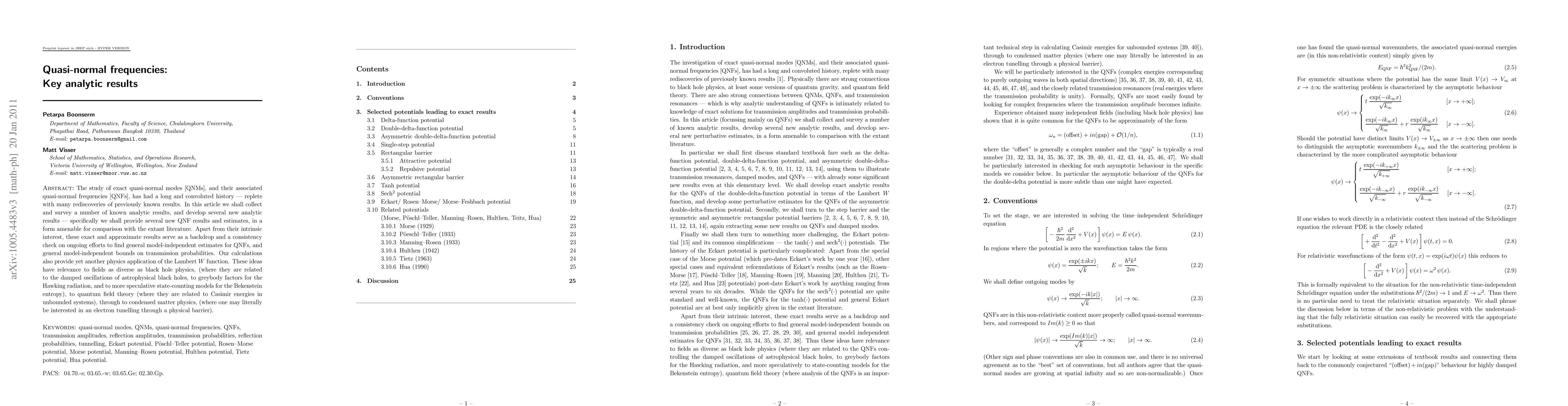 The study of exact quasi-normal modes [QNMs], and their associated quasi-normal frequencies [QNFs], has had a long and convoluted history - replete with many rediscoveries of previously known results. In this article we shall collect and survey a number of known analytic results, and develop several new analytic results - specifically we shall provide several new QNF results and estimates, in a form amenable for comparison with the extant literature. Apart from their intrinsic interest, these exact and approximate results serve as a backdrop and a consistency check on ongoing efforts to find general model-independent estimates for QNFs, and general model-independent bounds on transmission probabilities. Our calculations also provide yet another physics application of the Lambert W function. These ideas have relevance to fields as diverse as black hole physics, (where they are related to the damped oscillations of astrophysical black holes, to greybody factors for the Hawking radiation, and to more speculative state-counting models for the Bekenstein entropy), to quantum field theory (where they are related to Casimir energies in unbounded systems), through to condensed matter physics, (where one may literally be interested in an electron tunelling through a physical barrier).