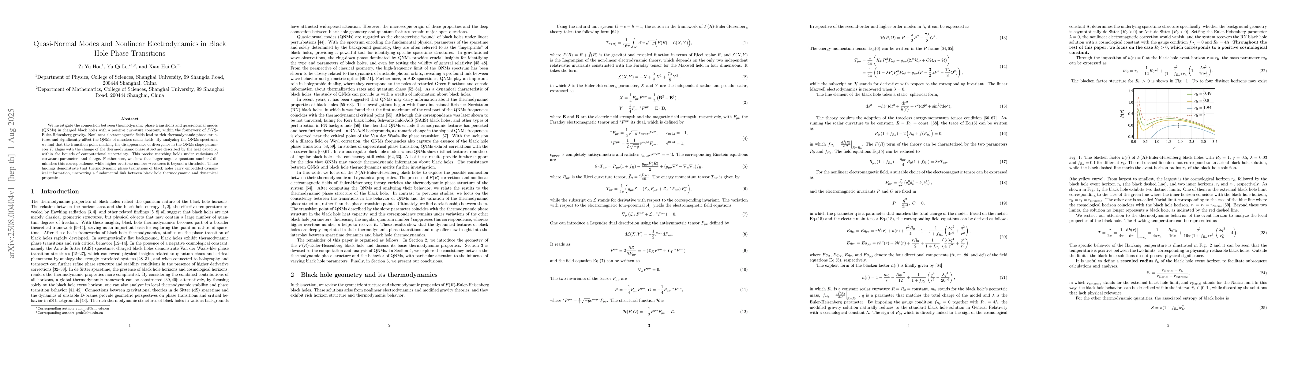 We investigate the connection between thermodynamic phase transitions and quasi-normal modes (QNMs) in charged black holes with a positive curvature constant, within the framework of $F(R)$-Euler-Heisenberg gravity. Nonlinear electromagnetic fields lead to rich thermodynamic phase structures and significantly affect the QNMs of massless scalar fields. By analyzing the QNMs spectrum, we find that the transition point marking the disappearance of divergence in the QNMs slope parameter $K$ aligns with the change of the thermodynamic phase structure described by the heat capacity, within the bounds of computational uncertainty. This precise matching holds under variations of curvature parameters and charge. Furthermore, we show that larger angular quantum number $l$ diminishes this correspondence, while higher overtone number $n$ restores it beyond a threshold. These findings demonstrate that thermodynamic phase transitions of black holes carry embedded dynamical information, uncovering a fundamental link between black hole thermodynamic and dynamical properties.