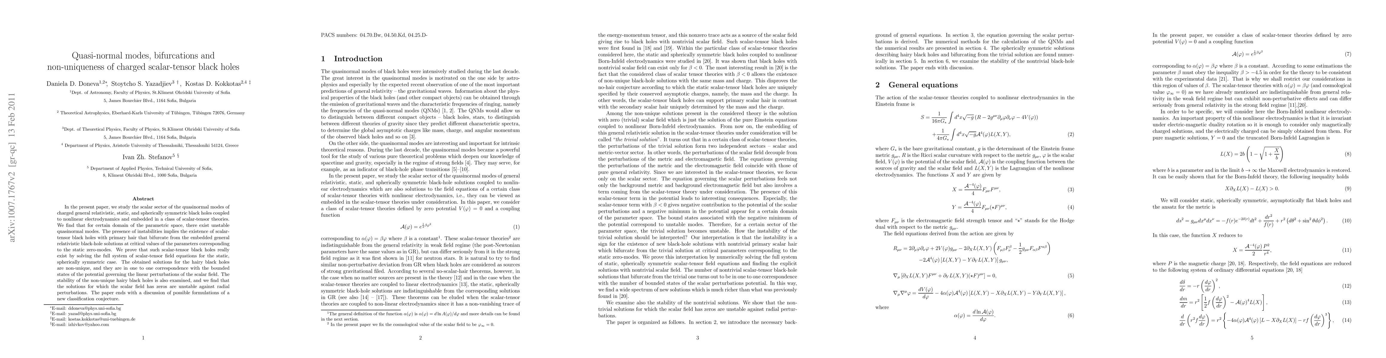 This paper investigates the quasi-normal modes of charged scalar-tensor black holes coupled to nonlinear electrodynamics, finding unstable modes and non-unique hairy black hole solutions that bifurcate from general relativistic black holes. Stability analysis reveals that solutions with zero scalar fields are unstable, and a new classification conjecture is proposed.