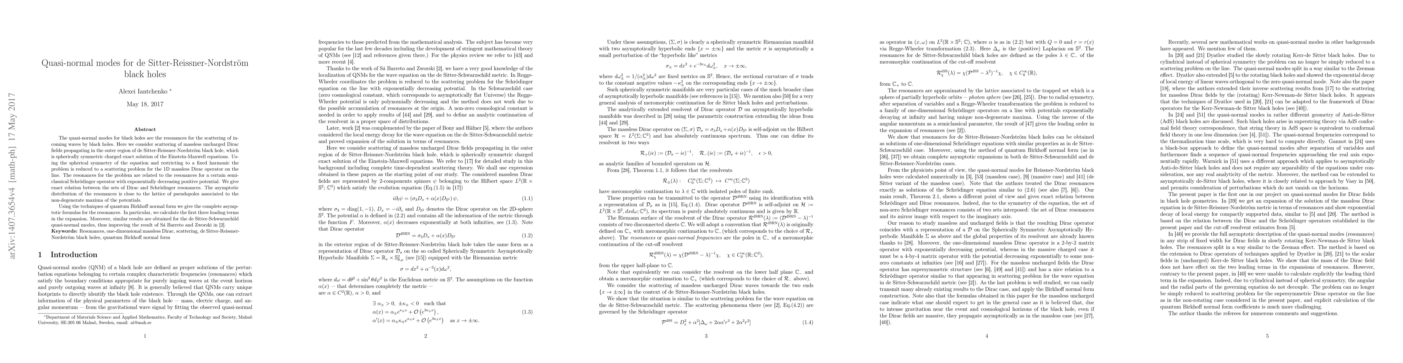 The quasi-normal modes for black holes are the resonances for the scattering of incoming waves by black holes. Here we consider scattering of massless uncharged Dirac fields propagating in the outer region of de Sitter-Reissner-Nordstr{\"o}m black hole, which is spherically symmetric charged exact solution of the Einstein-Maxwell equations. Using the spherical symmetry of the equation and restricting to a fixed harmonic the problem is reduced to a scattering problem for the 1D massless Dirac operator on the line. The resonances for the problem are related to the resonances for a certain semiclassical Schr{\"o}dinger operator with exponentially decreasing positive potential. We give exact relation between the sets of Dirac and Schr{\"o}dinger resonances. The asymptotic distribution of the resonances is close to the lattice of pseudopoles associated to the non-degenerate maxima of the potentials. Using the techniques of quantum Birkhoff normal form we give the complete asymptotic formulas for the resonances. In particular, we calculate the first three leading terms in the expansion. Moreover, similar results are obtained for the de Sitter-Schwarzschild quasi-normal modes, thus improving the result of S\'a Barreto and Zworski from 1997.