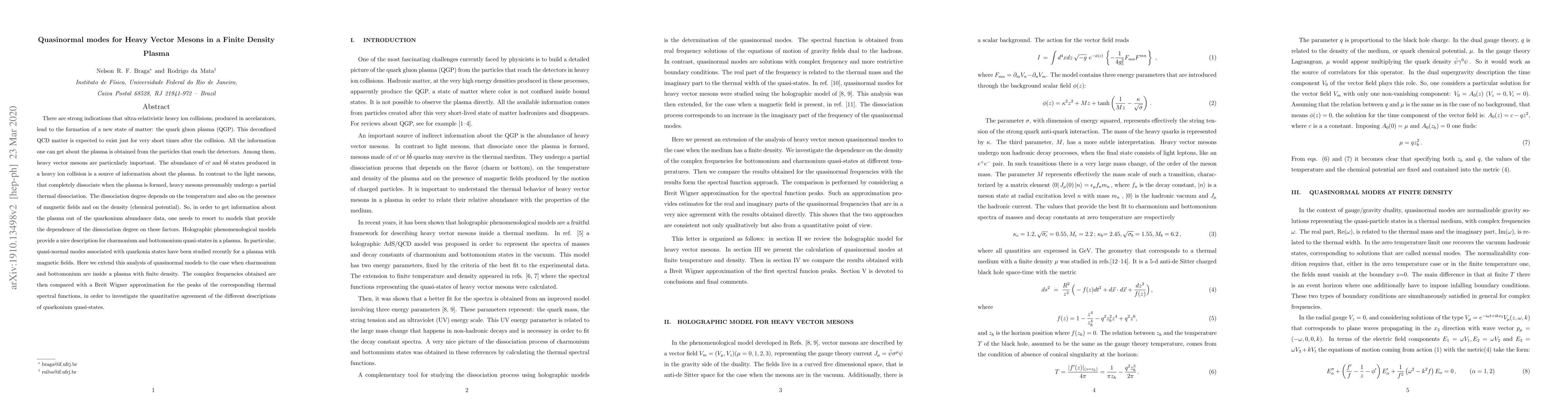 There are strong indications that ultra-relativistic heavy ion collisions, produced in accelarators, lead to the formation of a new state of matter: the quark gluon plasma (QGP). This deconfined QCD matter is expected to exist just for very short times after the collision. All the information one can get about the plasma is obtained from the particles that reach the detectors. Among them, heavy vector mesons are particularly important. The abundance of $ c {\bar c}$ and $b {\bar b}$ states produced in a heavy ion collision is a source of information about the plasma. In contrast to the light mesons, that completely dissociate when the plasma is formed, heavy mesons presumably undergo a partial thermal dissociation. The dissociation degree depends on the temperature and also on the presence of magnetic fields and on the density (chemical potential). So, in order to get information about the plasma out of the quarkonium abundance data, one needs to resort to models that provide the dependence of the dissociation degree on these factors. Holographic phenomenological models provide a nice description for charmonium and bottomonium quasi-states in a plasma. In particular, quasi-normal modes associated with quarkonia states have been studied recently for a plasma with magnetic fields. Here we extend this analysis of quasinormal models to the case when charmonium and bottomonium are inside a plasma with finite density. The complex frequencies obtained are then compared with a Breit Wigner approximation for the peaks of the corresponding thermal spectral functions, in order to investigate the quantitative agreement of the different descriptions of quarkonium quasi-states.