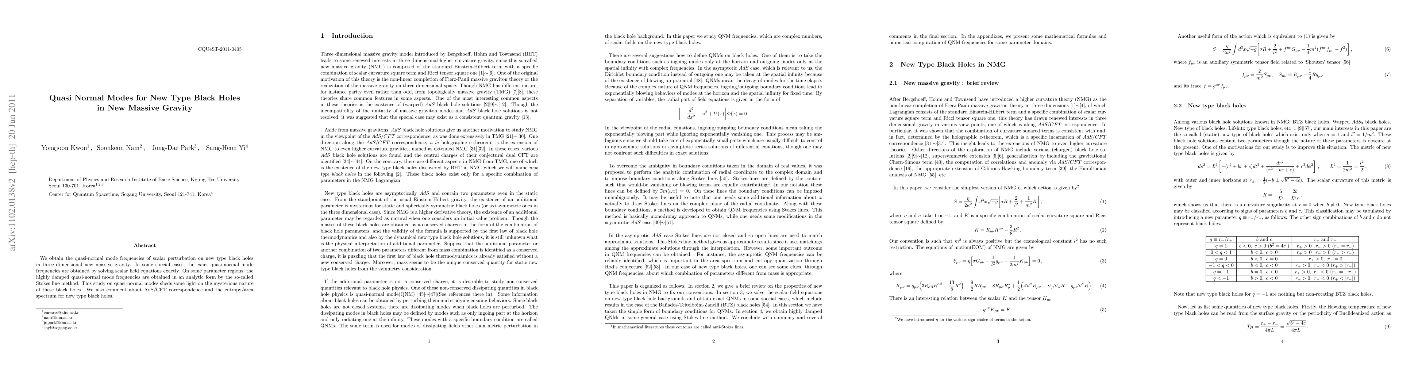 This paper determines quasi-normal mode frequencies for scalar perturbations on new type black holes in three-dimensional new massive gravity, providing exact solutions in special cases and analytic forms in others, which sheds light on the nature of these black holes and discusses AdS/CFT correspondence and entropy/area spectrum.