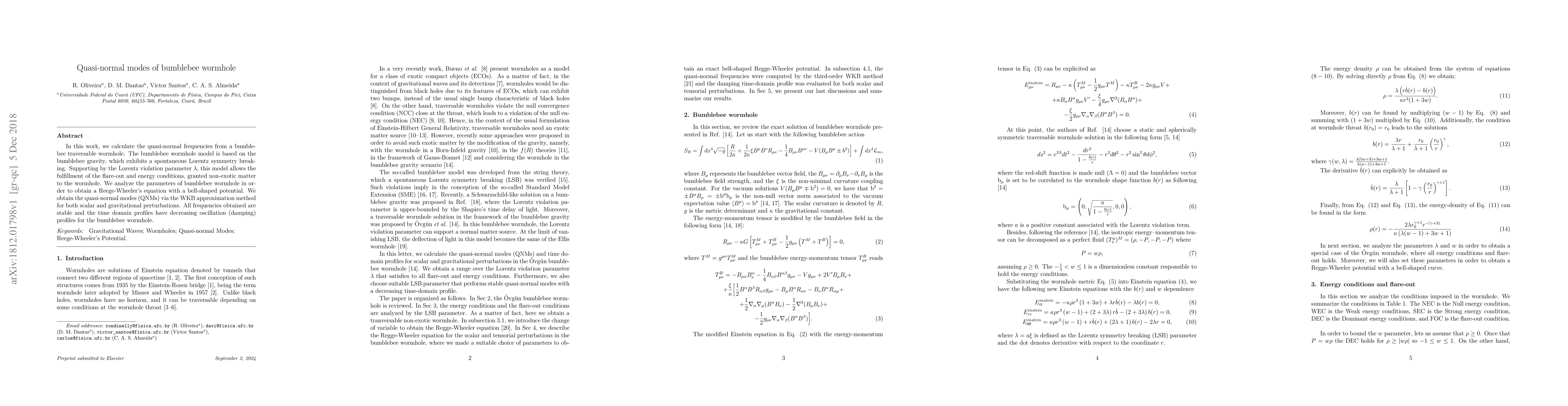 In this work, we calculate the quasi-normal frequencies from a bumblebee traversable wormhole. The bumblebee wormhole model is based on the bumblebee gravity, which exhibits a spontaneous Lorentz symmetry breaking. Supporting by the Lorentz violation parameter $\lambda$, this model allows the fulfillment of the flare-out and energy conditions, granted non-exotic matter to the wormhole. We analyze the parameters of bumblebee wormhole in order to obtain a Reege-Wheeler's equation with a bell-shaped potential. We obtain the quasi-normal modes (QNMs) via the WKB approximation method for both scalar and gravitational perturbations. All frequencies obtained are stable and the time domain profiles have decreasing oscillation (damping) profiles for the bumblebee wormhole.