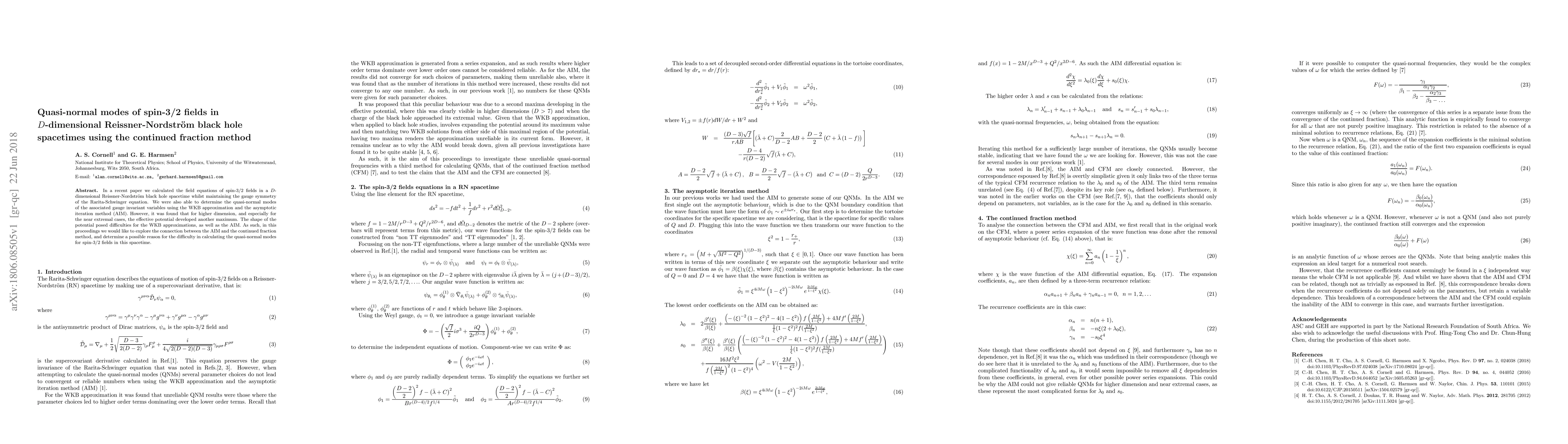 In a recent paper we calculated the field equations of spin-3/2 fields in a $D$-dimensional Reissner-Nordstr\"om black hole spacetime whilst maintaining the gauge symmetry of the Rarita-Schwinger equation. We were also able to determine the quasi-normal modes of the associated gauge invariant variables using the WKB approximation and the asymptotic iteration method (AIM). However, it was found that for higher dimension, and especially for the near extremal cases, the effective potential developed another maximum. The shape of the potential posed difficulties for the WKB approximations, as well as the AIM. As such, in this proceedings we would like to explore the connection between the AIM and the continued fraction method, and determine a possible reason for the difficulty in calculating the quasi-normal modes for spin-3/2 fields in this spacetime.