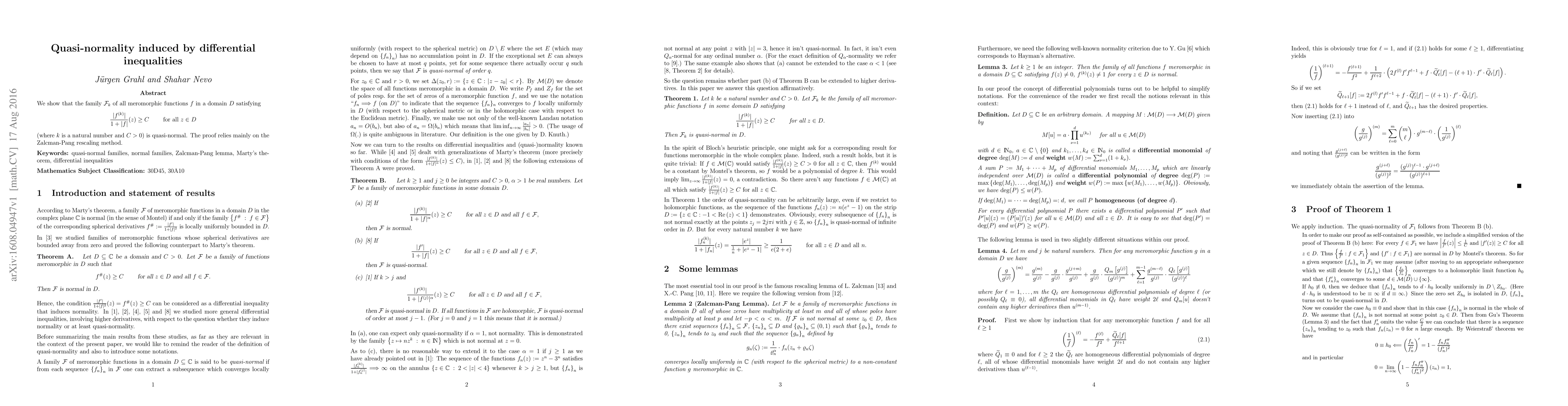 A family of meromorphic functions is shown to be quasi-normal based on differential inequalities that limit growth rate, using the Zalcman-Pang rescaling method.