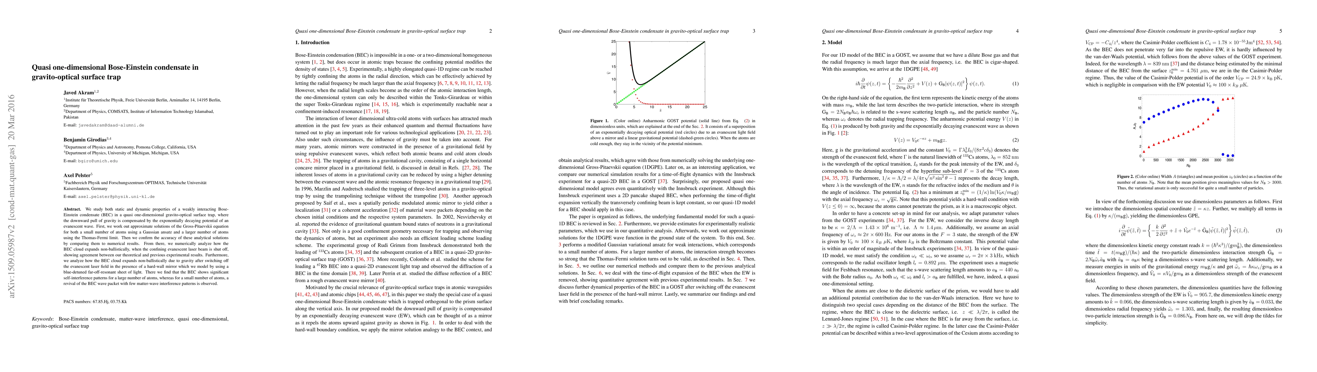 This paper investigates the static and dynamic properties of a weakly interacting Bose-Einstein condensate (BEC) in a quasi one-dimensional gravito-optical surface trap. Analytical solutions are derived and compared to numerical results, revealing non-ballistic expansion and self-interference patterns in the BEC cloud.