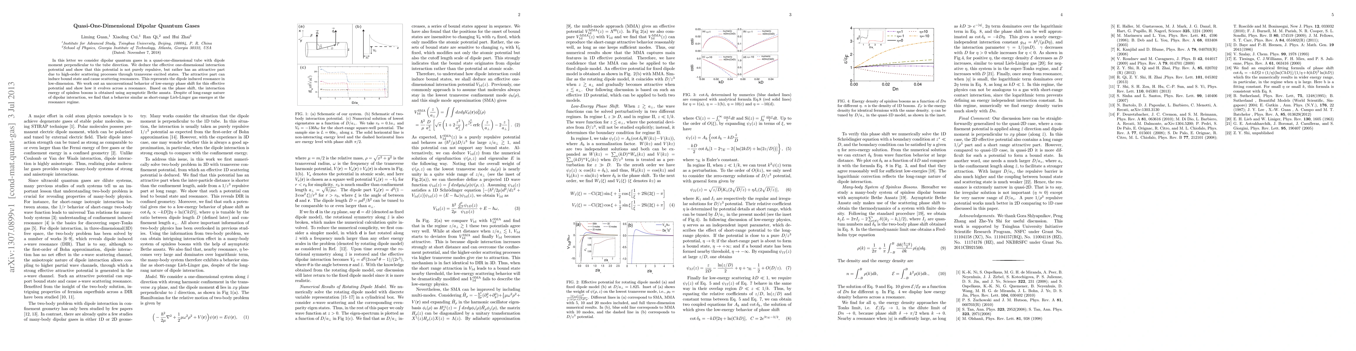 This paper investigates dipolar quantum gases confined in a quasi-one-dimensional tube, revealing an effective one-dimensional interaction potential that includes an attractive component due to high-order scattering processes. The study uncovers dipole-induced resonances and unconventional low-energy phase shift behavior, leading to a short-range-like interaction at resonance despite the long-range nature of dipolar forces.