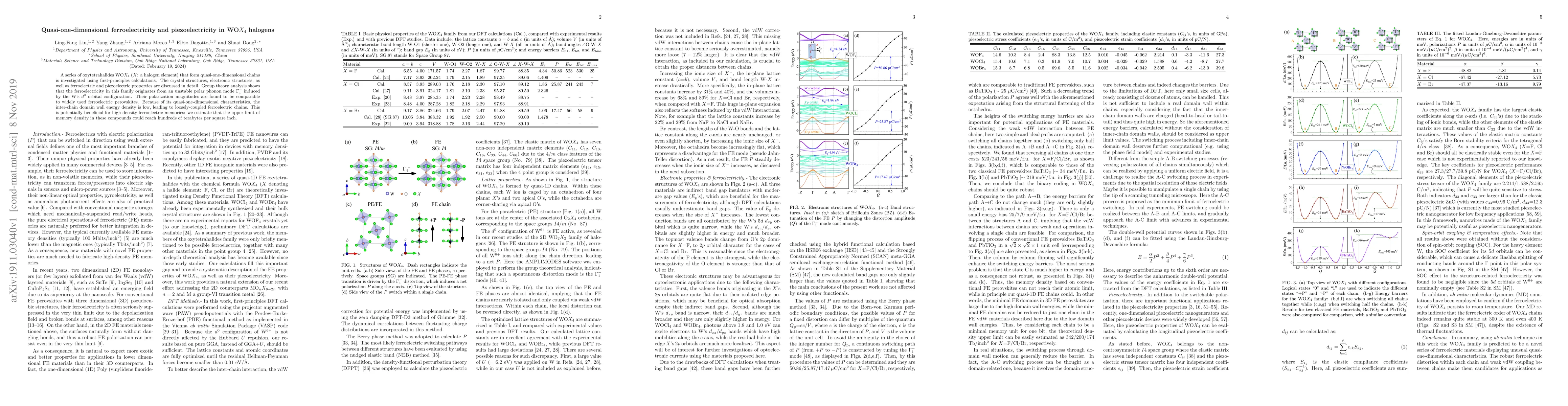 The study investigates WO$X_4$ oxytetrahalides with quasi-one-dimensional structures for ferroelectricity and piezoelectricity, revealing their potential for high-density memory applications due to low inter-chain domain wall energy density. The ferroelectricity arises from a polar phonon mode, and their polarization magnitudes rival those of perovskite ferroelectrics.