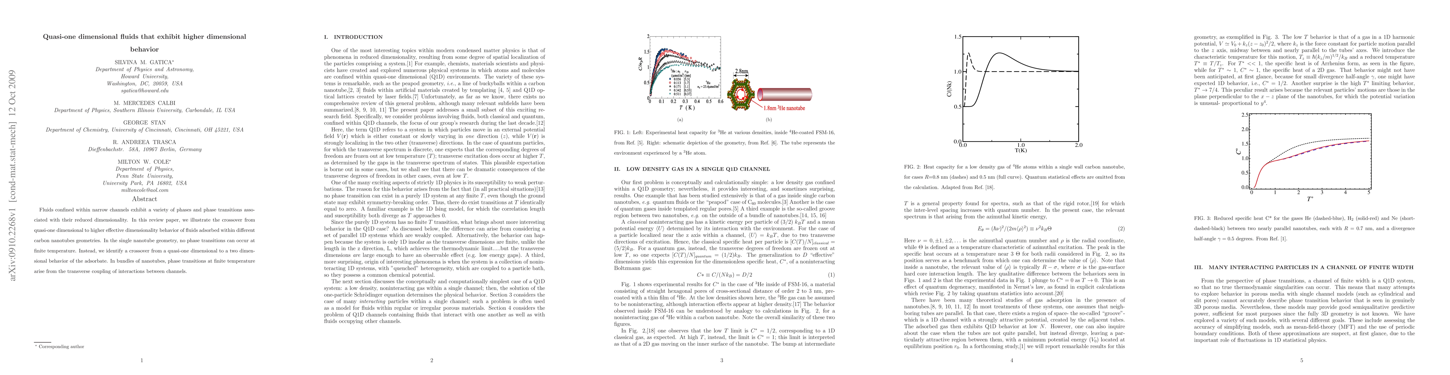 This review explores how fluids confined in narrow carbon nanotube channels exhibit phase transitions and behavior transitioning from quasi-one dimensional to higher effective dimensions, with single nanotubes showing a crossover to two-dimensional behavior without phase transitions, while nanotube bundles display phase transitions due to transverse coupling.