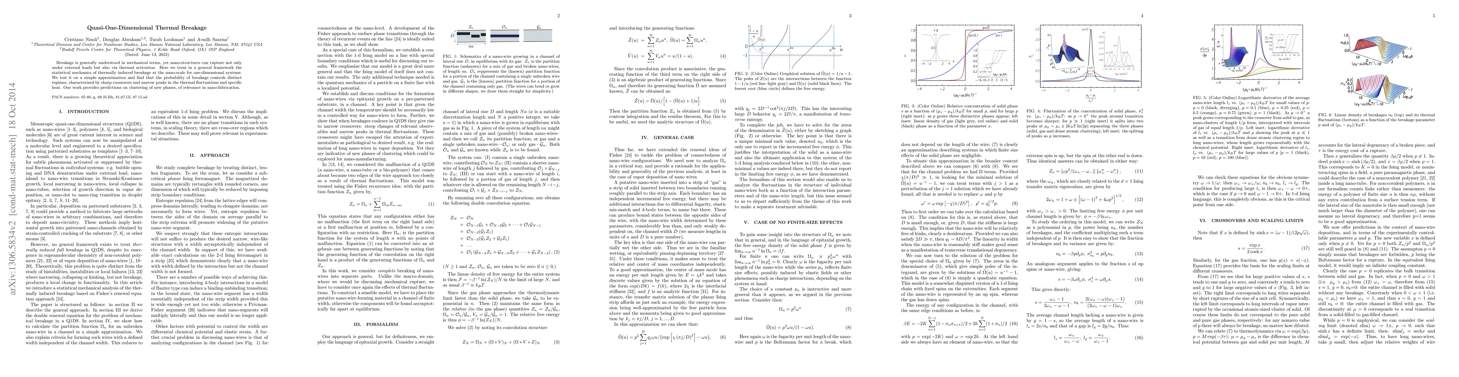 Breakage is generally understood in mechanical terms, yet nano-structures can rupture not only under external loads but also via thermal activation. Here we treat in a general framework the statistical mechanics of thermally induced breakage at the nano-scale for one-dimensional systems. We test it on a simple approximation and find that the probability of breakage controls distinct regimes, characterized by sharp crossovers and narrow peaks in the thermal fluctuations and specific heat. Our work provides predictions on clustering of new phases, of relevance in nano-fabrication.