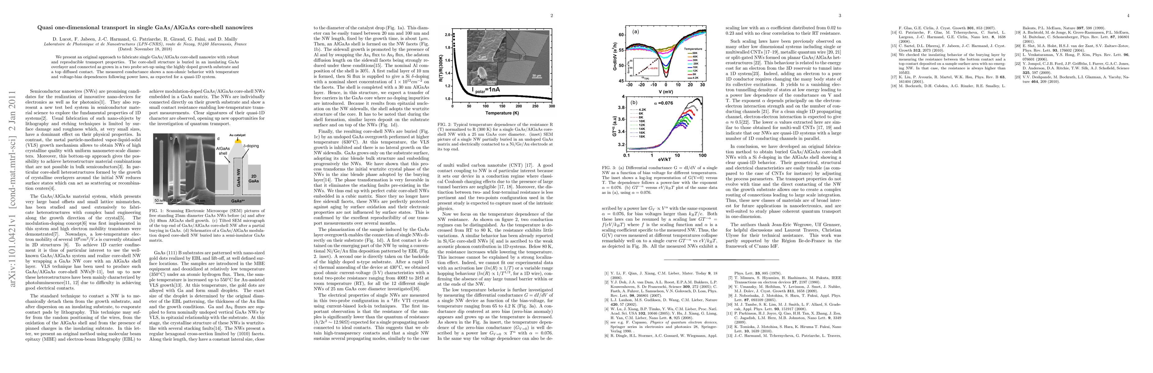 This paper details the fabrication of single GaAs/AlGaAs core-shell nanowires with robust transport properties, revealing non-ohmic conductance behavior that follows power laws indicative of quasi-one-dimensional transport. The core-shell structure is embedded in an insulating GaAs overlayer and connected in a two-probe setup.