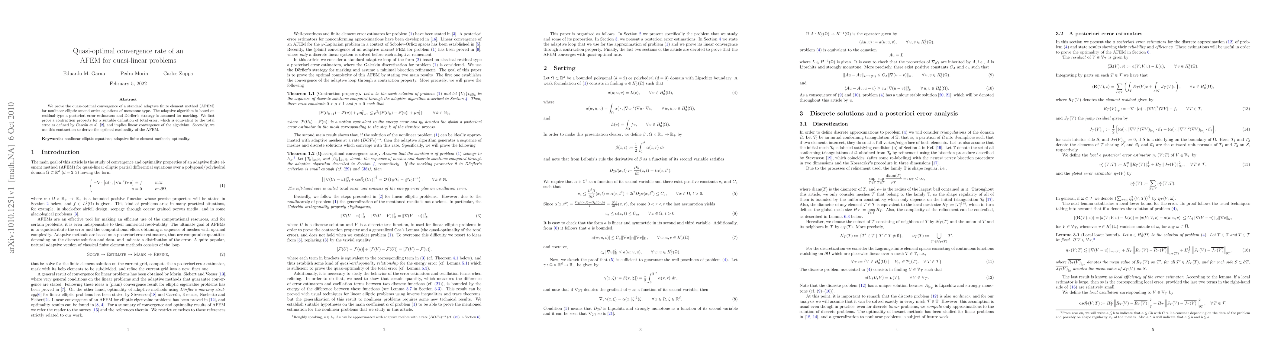 This paper proves the quasi-optimal convergence of an adaptive finite element method (AFEM) for quasi-linear elliptic problems, demonstrating linear convergence through a contraction property. The study also derives the optimal number of elements in the adaptive algorithm.