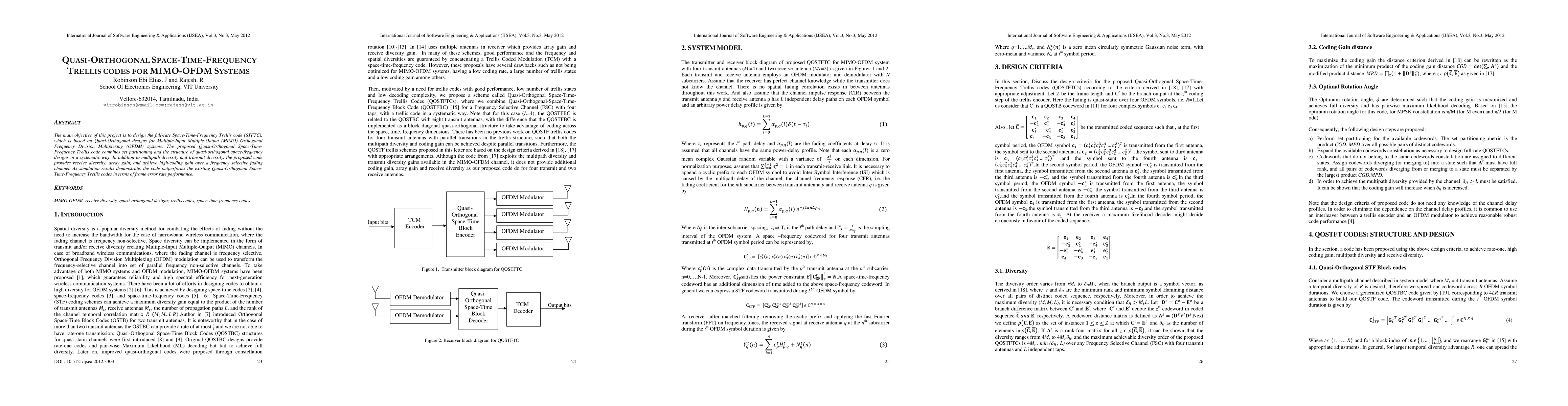 The main objective of this project is to design the full-rate Space-Time-Frequency Trellis code (STFTC), which is based on Quasi-Orthogonal designs for Multiple-Input Multiple-Output (MIMO) Orthogonal Frequency Division Multiplexing (OFDM) systems. The proposed Quasi-Orthogonal Space-Time-Frequency Trellis code combines set partitioning and the structure of quasi-orthogonal space-frequency designs in a systematic way. In addition to multipath diversity and transmit diversity, the proposed code provides receive diversity, array gain, and achieve high-coding gain over a frequency selective fading channel. As simulation results demonstrate, the code outperforms the existing Quasi-Orthogonal Space-Time-Frequency Trellis codes in terms of frame error rate performance.