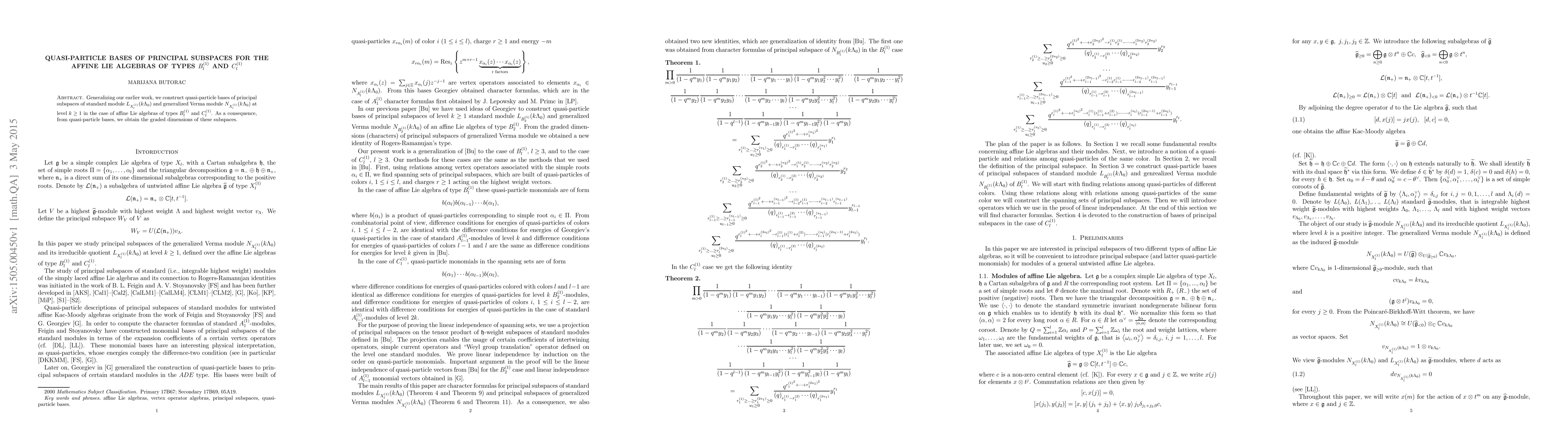 Generalizing our earlier work, we construct quasi-particle bases of principal subspaces of standard module $L_{X_l^{(1)}}(k\Lambda_0)$ and generalized Verma module $N_{X_l^{(1)}}(k\Lambda_0)$ at level $k\geq 1$ in the case of affine Lie algebras of types $B_l^{(1)}$ and $C_l^{(1)}$. As a consequence, from quasi-particle bases, we obtain the graded dimensions of these subspaces.