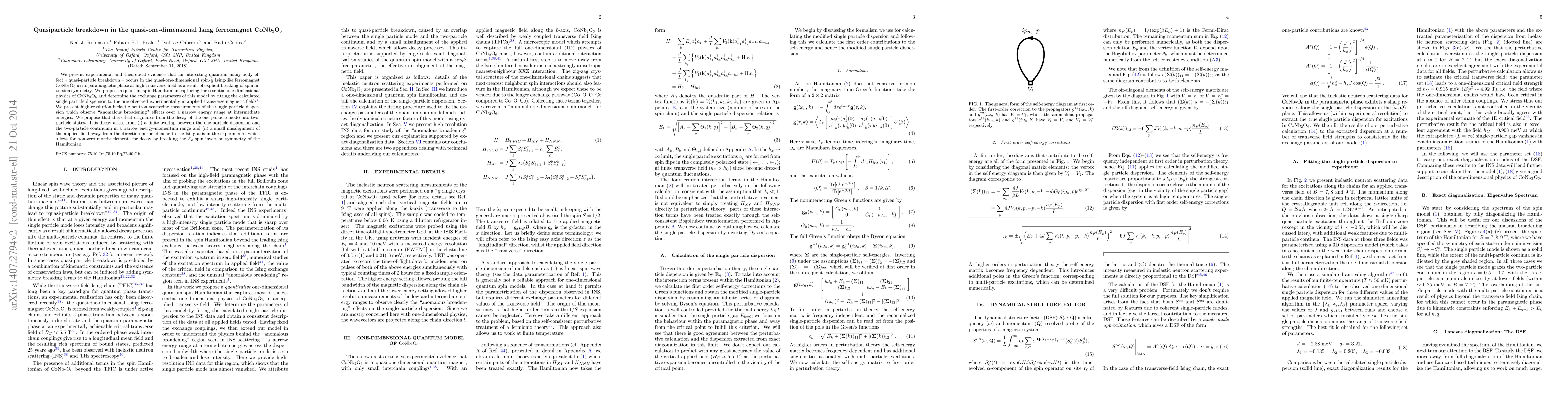 Researchers found a quantum many-body effect called quasi-particle breakdown in the material CoNb2O6 at high transverse field strengths, breaking spin inversion symmetry. This leads to 'anomalous broadening' effects that decay into two-particle states due to overlap and misaligned magnetic fields.