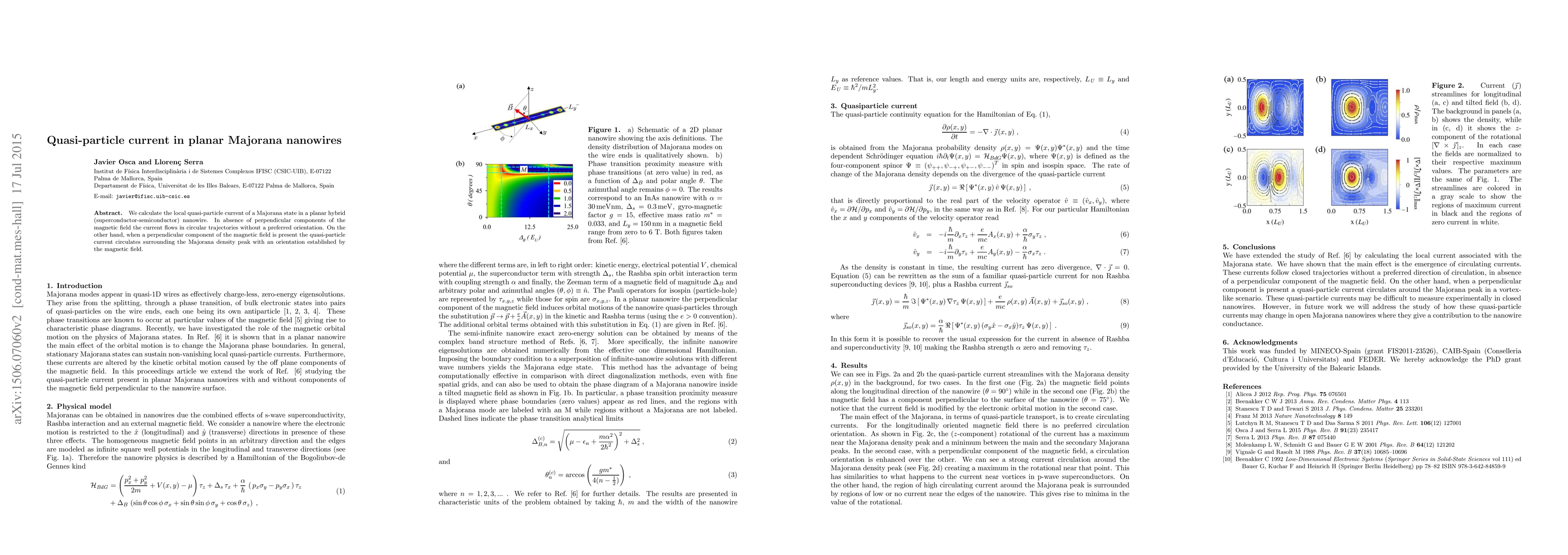 This study investigates the local quasi-particle current in planar Majorana nanowires, finding that without perpendicular magnetic fields, the current flows in circular trajectories without a preferred orientation. With a perpendicular magnetic field, the current circulates around the Majorana density peak, oriented by the magnetic field.