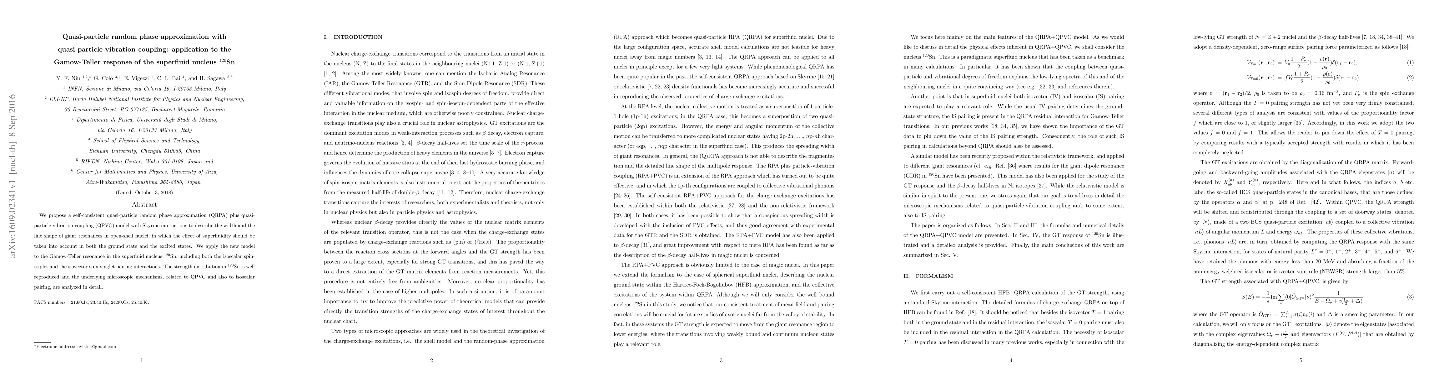 This paper proposes a self-consistent quasi-particle random phase approximation with quasi-particle-vibration coupling model to describe giant resonances in superfluid nuclei, applying it to the Gamow-Teller response in $^{120}$Sn. The model successfully reproduces the strength distribution and analyzes the microscopic mechanisms involving QPVC and isoscalar pairing.