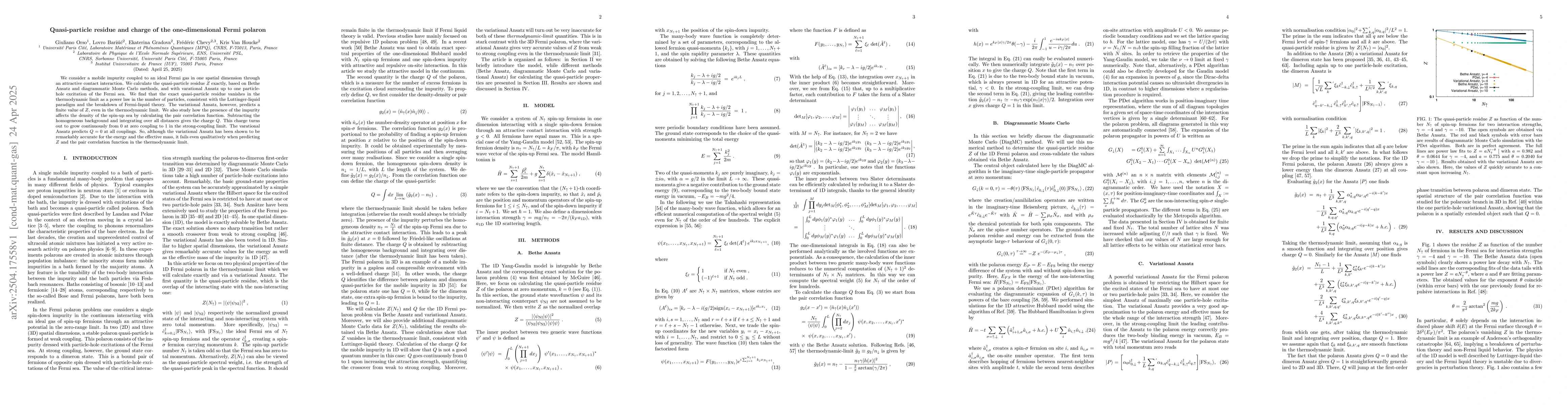 Researchers studied a mobile impurity in a one-dimensional Fermi gas, finding that quasi-particle residue vanishes as particles increase, but a variational Ansatz predicts a finite value; the presence of the impurity causes charge to grow continuously from 0 to 1 at strong coupling.