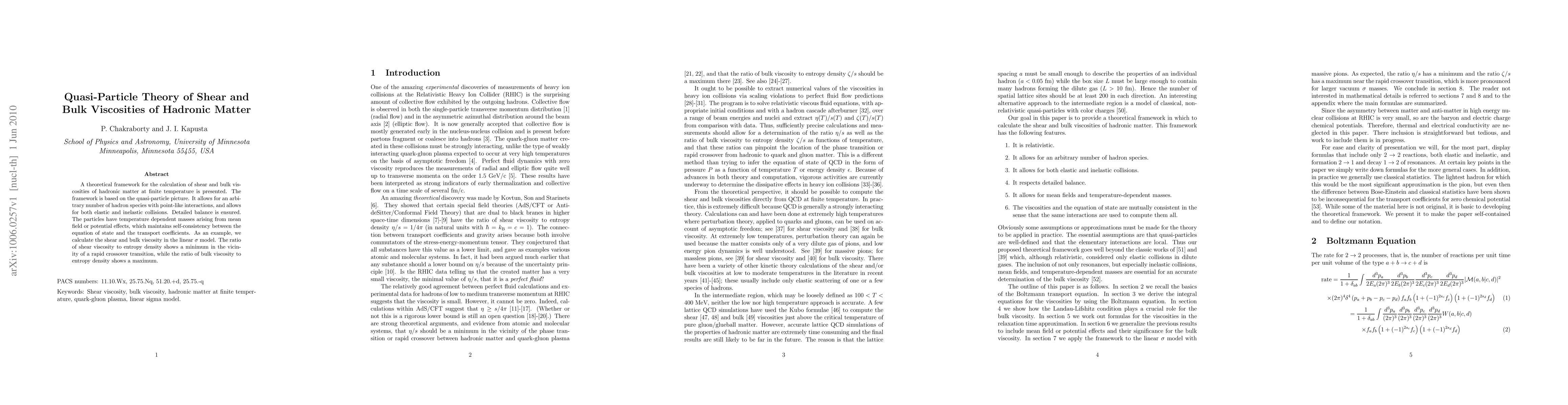 This paper develops a quasi-particle theory framework to calculate shear and bulk viscosities in hadronic matter at finite temperature, considering various hadron species and collision types. The model ensures detailed balance and temperature-dependent masses, demonstrating its application in the linear $\sigma$ model, where viscosity ratios exhibit distinct minima and maxima near a crossover transition.