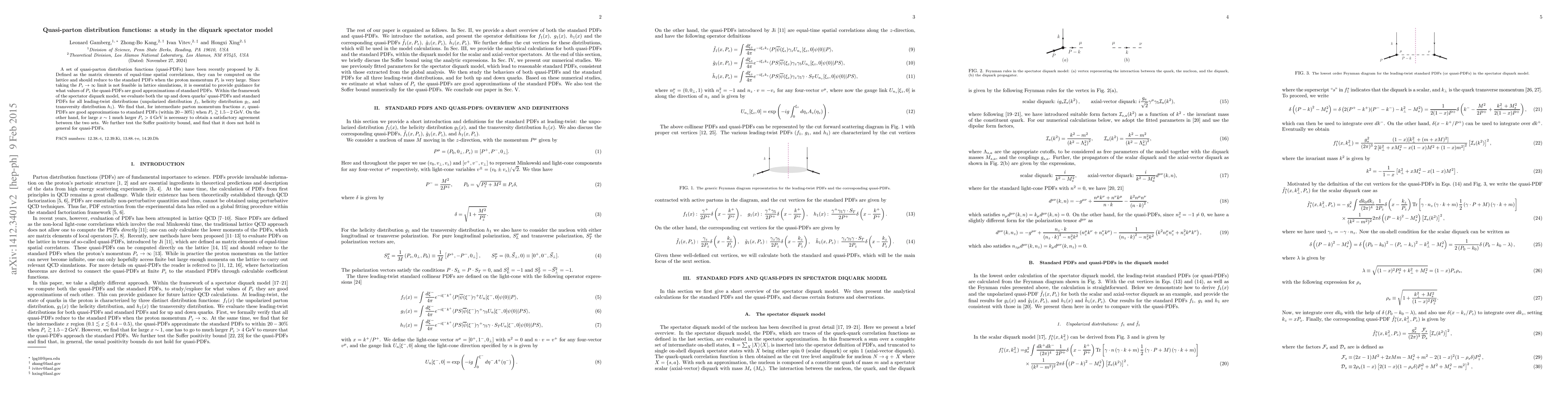 This paper investigates quasi-parton distribution functions (quasi-PDFs) within the spectator diquark model, finding that quasi-PDFs approximate standard PDFs within 20-30% for intermediate parton momentum fractions when proton momentum $P_z$ is around 1.5-2 GeV. For large $x\sim 1$, $P_z > 4$ GeV is required for satisfactory agreement. The Soffer positivity bound does not generally hold for quasi-PDFs.