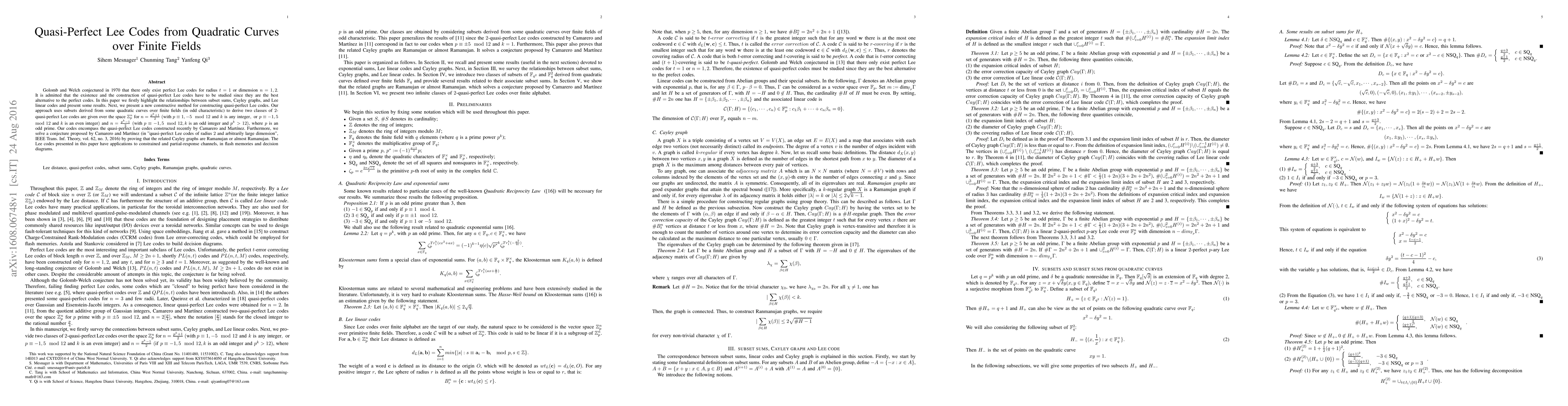 This paper introduces a new method for constructing quasi-perfect Lee codes using quadratic curves over finite fields. It addresses Golomb-Welch's conjecture, proving that these codes are Ramanujan or almost Ramanujan and expanding on recent constructions by Camarero and Martínez.