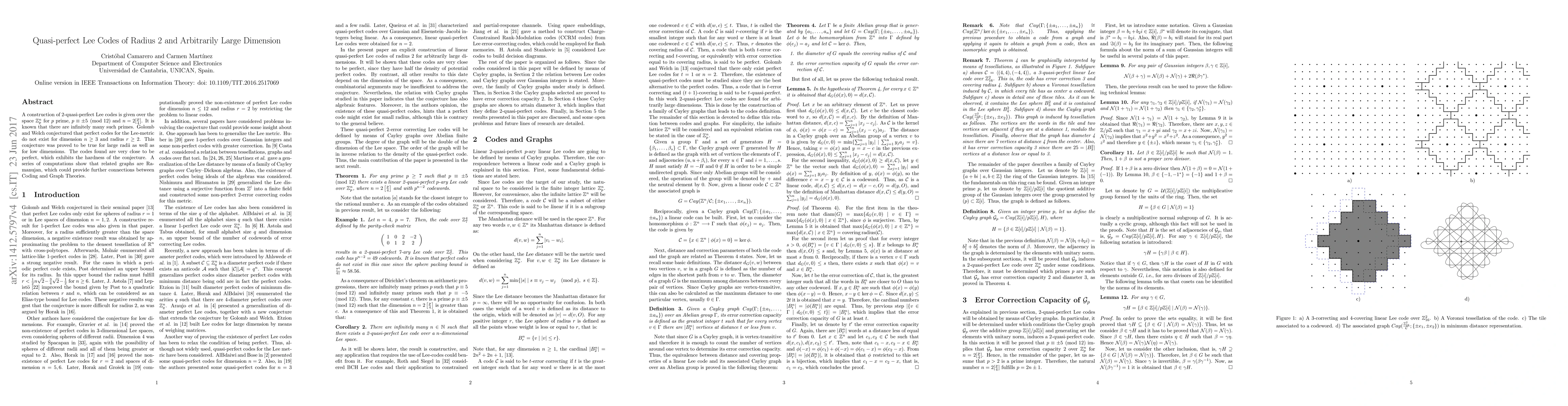 A construction of 2-quasi-perfect Lee codes is given over the space $\mathbb Z_p^n$ for $p$ prime, $p\equiv \pm 5\pmod{12}$ and $n=2[\frac{p}{4}]$. It is known that there are infinitely many such primes. Golomb and Welch conjectured that perfect codes for the Lee-metric do not exist for dimension $n\geq 3$ and radius $r\geq 2$. This conjecture was proved to be true for large radii as well as for low dimensions. The codes found are very close to be perfect, which exhibits the hardness of the conjecture. A series of computations show that related graphs are Ramanujan, which could provide further connections between Coding and Graph Theories.