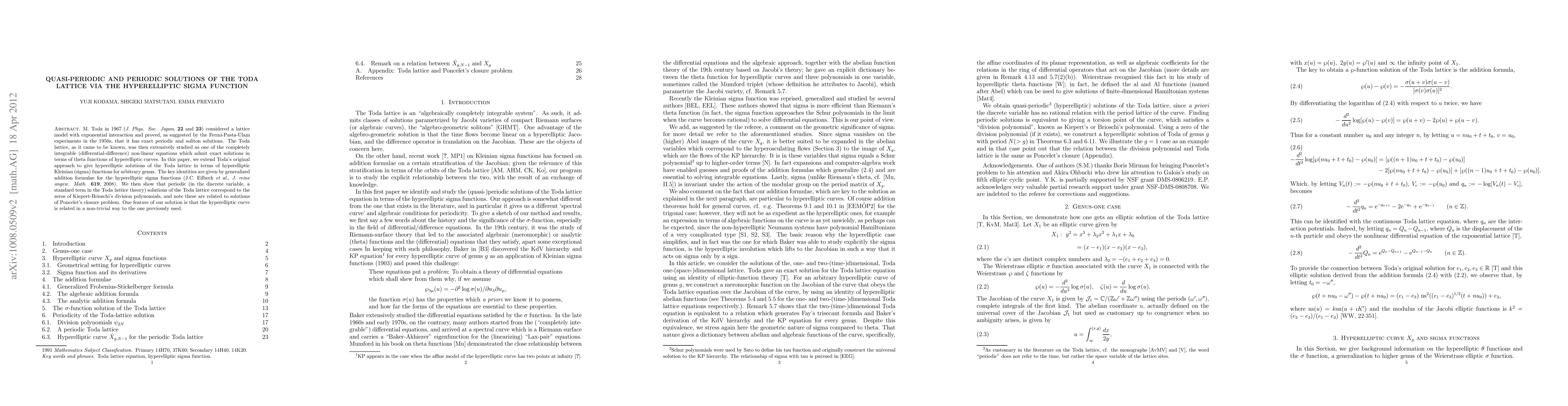 Researchers extend M. Toda's work on the Toda lattice to provide hyperelliptic solutions using sigma functions for arbitrary genus, linking it to Kiepert-Brioschi division polynomials and Poncelet's closure problem.