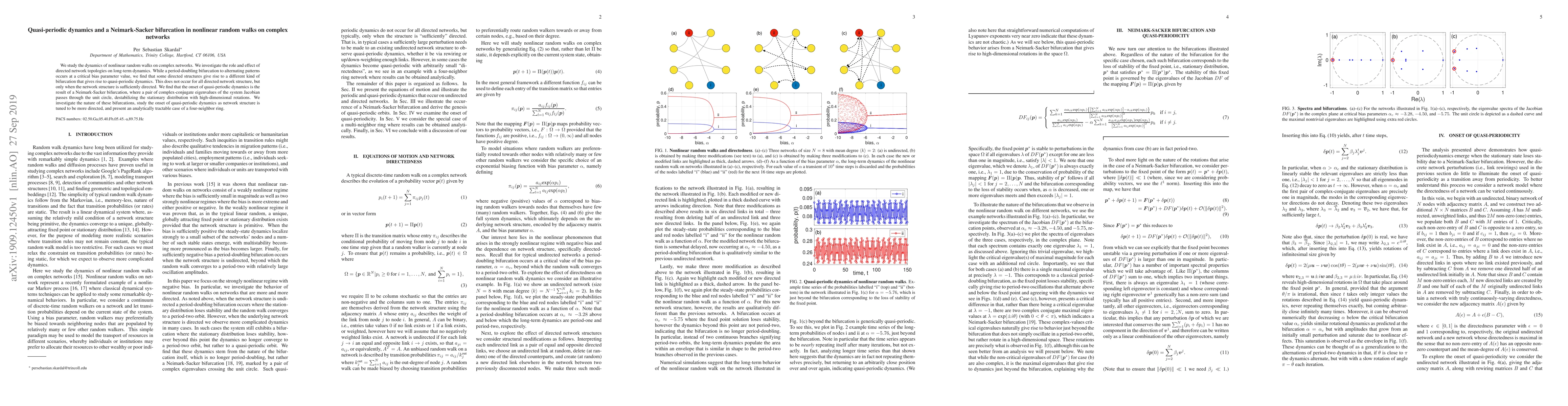 This paper explores nonlinear random walks on complex networks, revealing that certain directed network topologies lead to quasi-periodic dynamics through a Neimark-Sacker bifurcation, where complex-conjugate eigenvalues cross the unit circle, destabilizing the stationary distribution. The study focuses on how network directionality influences these dynamics, presenting a detailed analysis of a four-neighbor ring model.