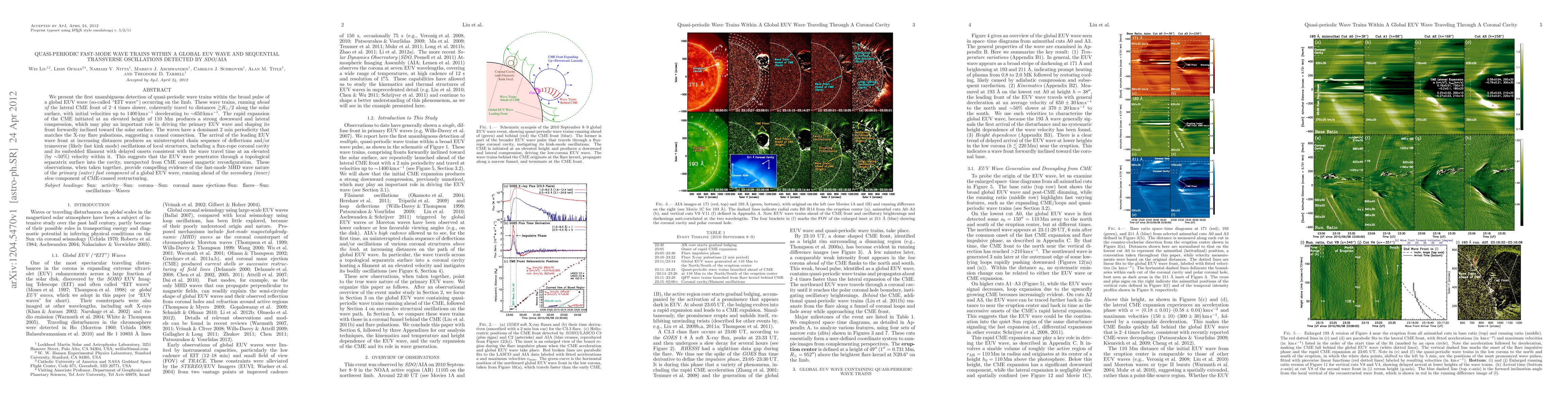 We present the first unambiguous detection of quasi-periodic wave trains within the broad pulse of a global EUV wave (so-called "EIT wave") occurring on the limb. These wave trains, running ahead of the lateral CME front of 2-4 times slower, coherently travel to distances $>R_{sun}/2$ along the solar surface, with initial velocities up to 1400 km/s decelerating to ~650 km/s. The rapid expansion of the CME initiated at an elevated height of 110 Mm produces a strong downward and lateral compression, which may play an important role in driving the primary EUV wave and shaping its front forwardly inclined toward the solar surface. The waves have a dominant 2 min periodicity that matches the X-ray flare pulsations, suggesting a causal connection. The arrival of the leading EUV wave front at increasing distances produces an uninterrupted chain sequence of deflections and/or transverse (likely fast kink mode) oscillations of local structures, including a flux-rope coronal cavity and its embedded filament with delayed onsets consistent with the wave travel time at an elevated (by ~50%) velocity within it. This suggests that the EUV wave penetrates through a topological separatrix surface into the cavity, unexpected from CME caused magnetic reconfiguration. These observations, when taken together, provide compelling evidence of the fast-mode MHD wave nature of the {\it primary (outer) fast component} of a global EUV wave, running ahead of the {\it secondary (inner) slow} component of CME-caused restructuring.