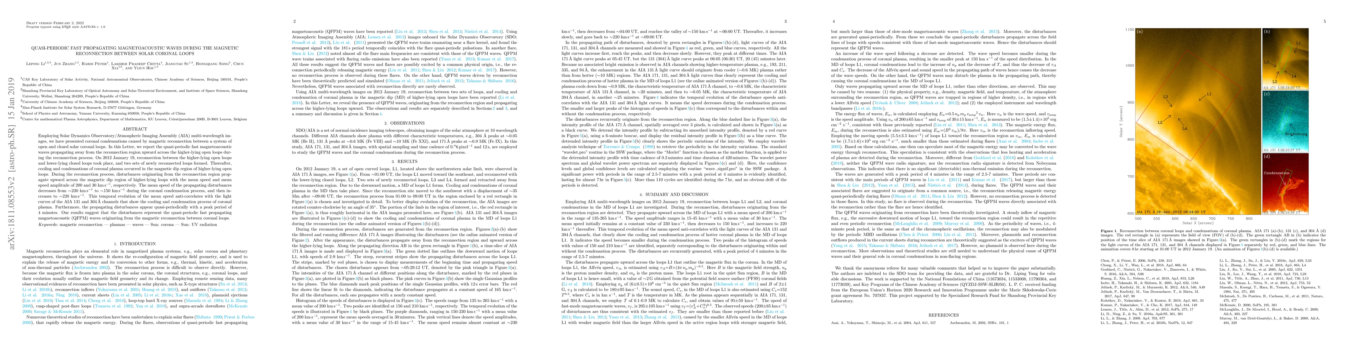 This study reports quasi-periodic fast propagating magnetoacoustic waves during magnetic reconnection between solar coronal loops, observed using AIA multi-wavelength images. The waves, with speeds decreasing and then increasing during the condensation process, suggest they are quasi-periodic fast propagating magnetoacoustic (QFPM) waves originating from the reconnection region.