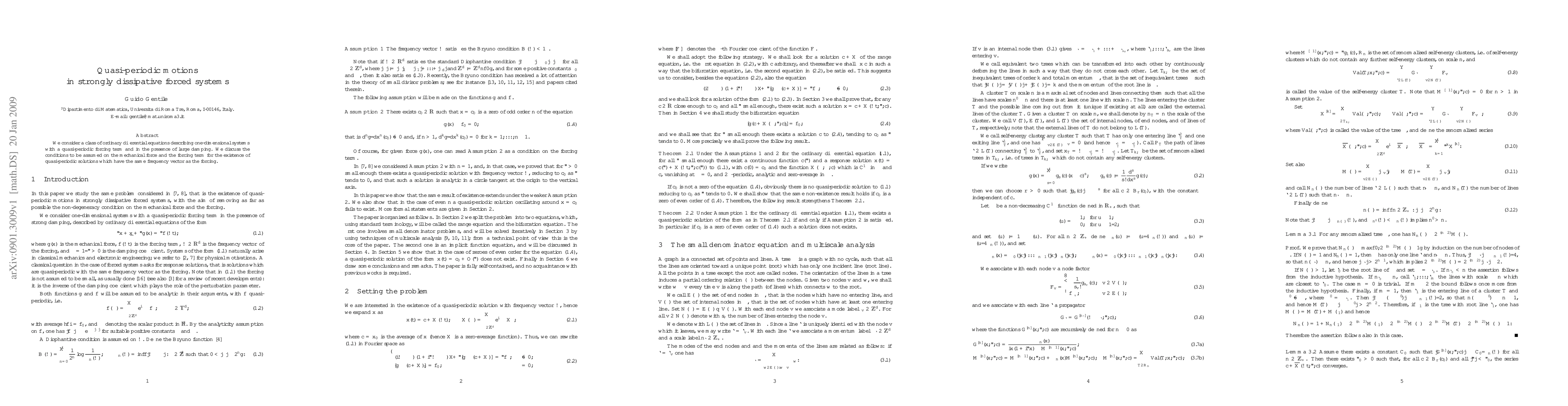 We consider a class of ordinary differential equations describing one-dimensional systems with a quasi-periodic forcing term and in the presence of large damping. We discuss the conditions to be assumed on the mechanical force and the forcing term for the existence of quasi-periodic solutions which have the same frequency vector as the forcing.