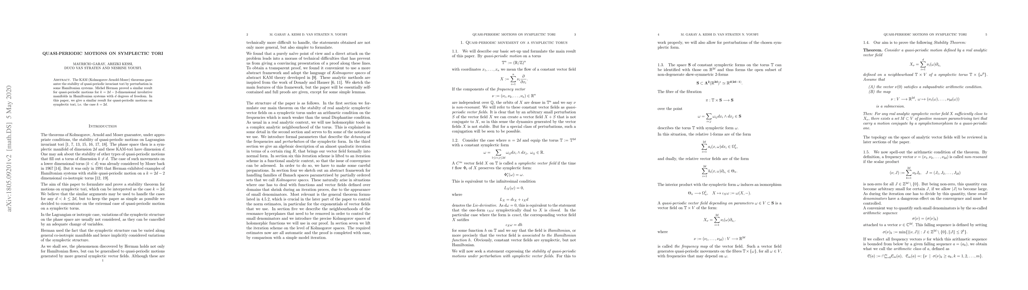 The KAM (Kolmogorov-Arnold-Moser) theorem guarantees the stability of quasi-periodic invariant tori by perturbation in some Hamiltonian systems. Michel Herman proved a similar result for quasi-periodic motions, with $k$-dimensional involutive manifolds in Hamiltonian systems with $n$ degrees of freedom $n \leq k < 2n $. In this paper, we extend this result to the case of a quasi-periodic motion on symplectic tori $k = 2n$.