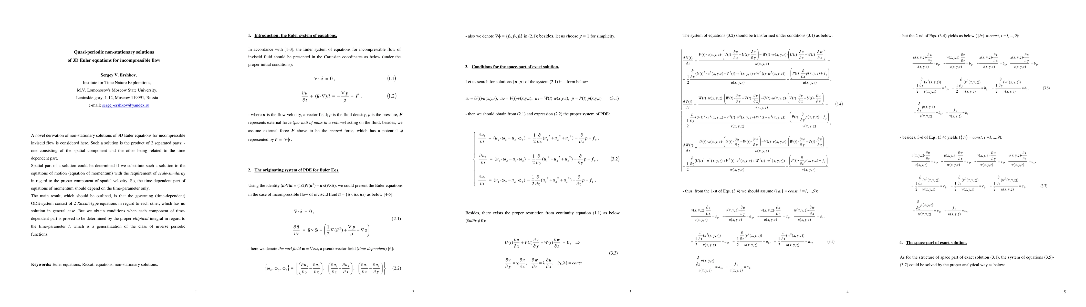 A novel derivation of non-stationary solutions of 3D Euler equations for incompressible inviscid flow is considered here. Such a solution is the product of 2 separated parts: - one consisting of the spatial component and the other being related to the time dependent part. Spatial part of a solution could be determined if we substitute such a solution to the equations of motion (equation of momentum) with the requirement of scale-similarity in regard to the proper component of spatial velocity. So, the time-dependent part of equations of momentum should depend on the time-parameter only. The main result, which should be outlined, is that the governing (time-dependent) ODE-system consist of 2 Riccati-type equations in regard to each other, which has no solution in general case. But we obtain conditions when each component of time-dependent part is proved to be determined by the proper elliptical integral in regard to the time-parameter t, which is a generalization of the class of inverse periodic functions.