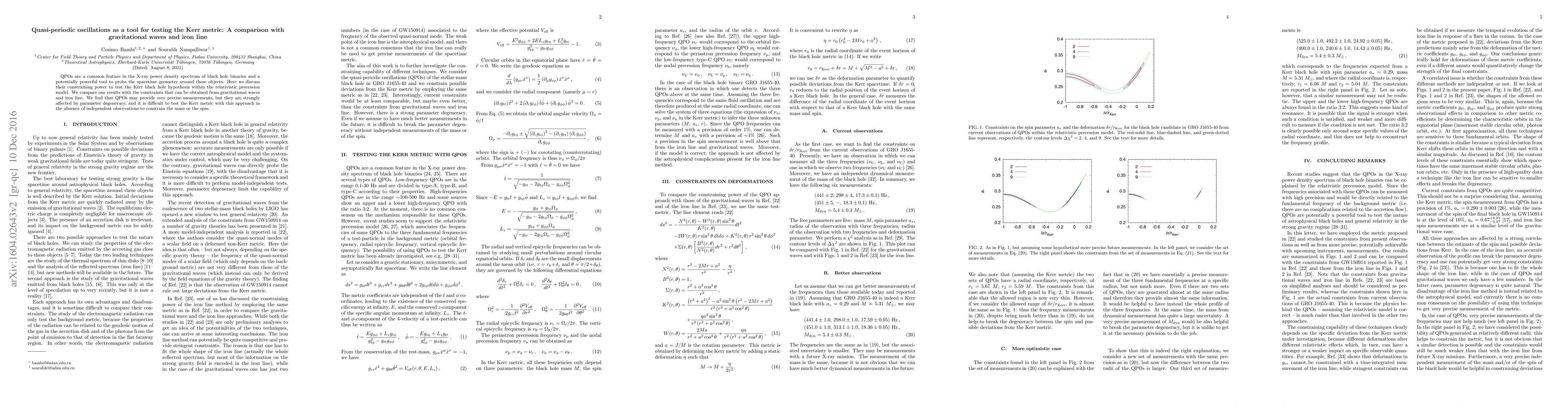 Summary: This paper investigates quasi-periodic oscillations (QPOs) in black hole binaries for testing the Kerr metric, comparing their precision to gravitational waves and iron lines. It concludes that while QPOs offer precise measurements, parameter degeneracy complicates testing the Kerr metric without independent mass or spin constraints.