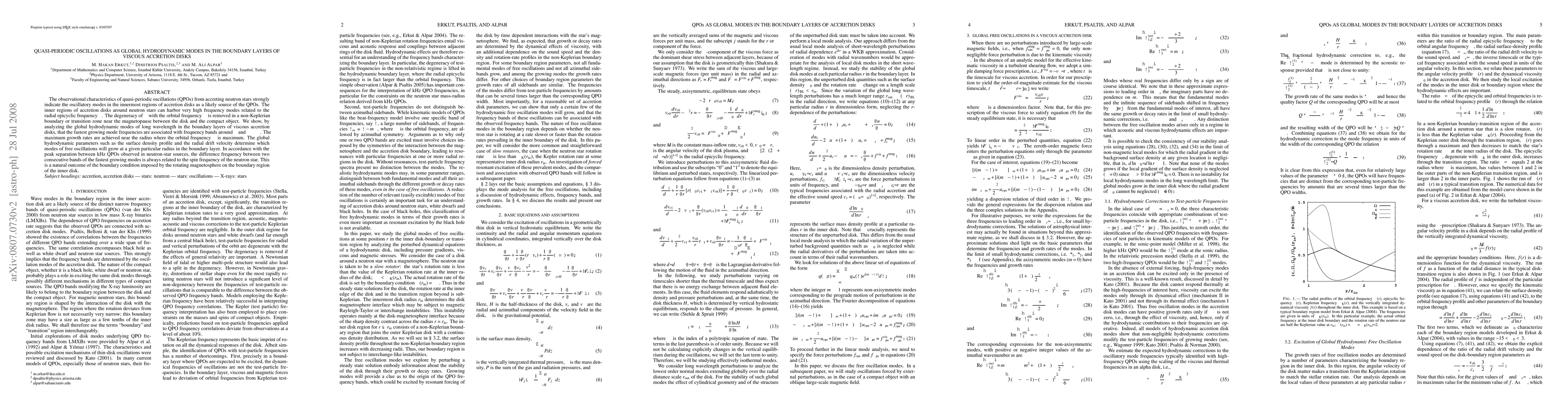 This paper investigates quasi-periodic oscillations (QPOs) in accretion disks around neutron stars, attributing them to global hydrodynamic modes in the boundary layers. The study finds that the fastest growing mode frequencies correspond to the radial epicyclic frequency $\kappa$ and $\kappa \pm \Omega$, with maximum growth rates near the radius where the orbital frequency $\Omega$ peaks.