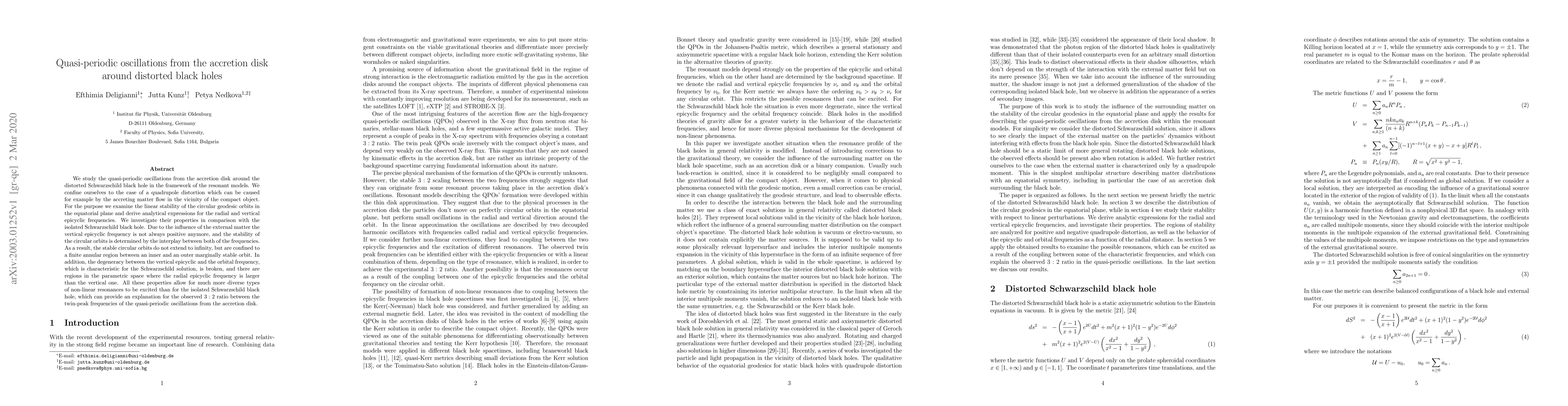 This paper investigates quasi-periodic oscillations from the accretion disk around a distorted Schwarzschild black hole, focusing on quadrupole distortions. It derives analytical expressions for radial and vertical epicyclic frequencies, revealing that stable circular orbits are confined to a finite region and that the degeneracy between vertical and orbital frequencies is broken, leading to diverse non-linear resonances that may explain observed quasi-periodic oscillation frequencies.
