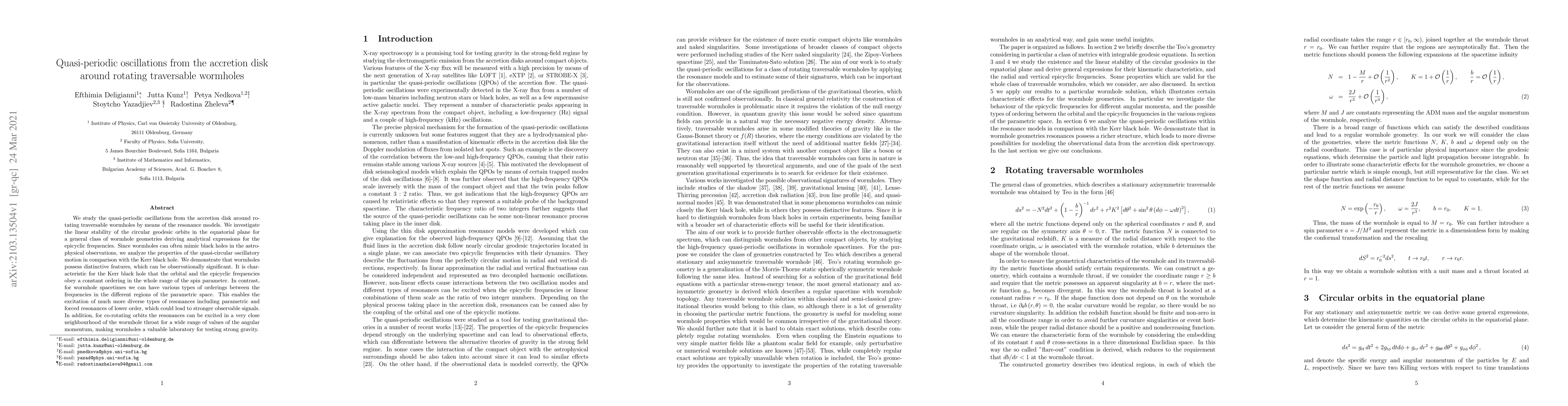 This paper investigates quasi-periodic oscillations from accretion disks around rotating traversable wormholes, comparing their epicyclic frequencies to those around Kerr black holes. It finds that wormholes exhibit diverse resonance types and stronger observable signals, making them a valuable test for strong gravity theories.