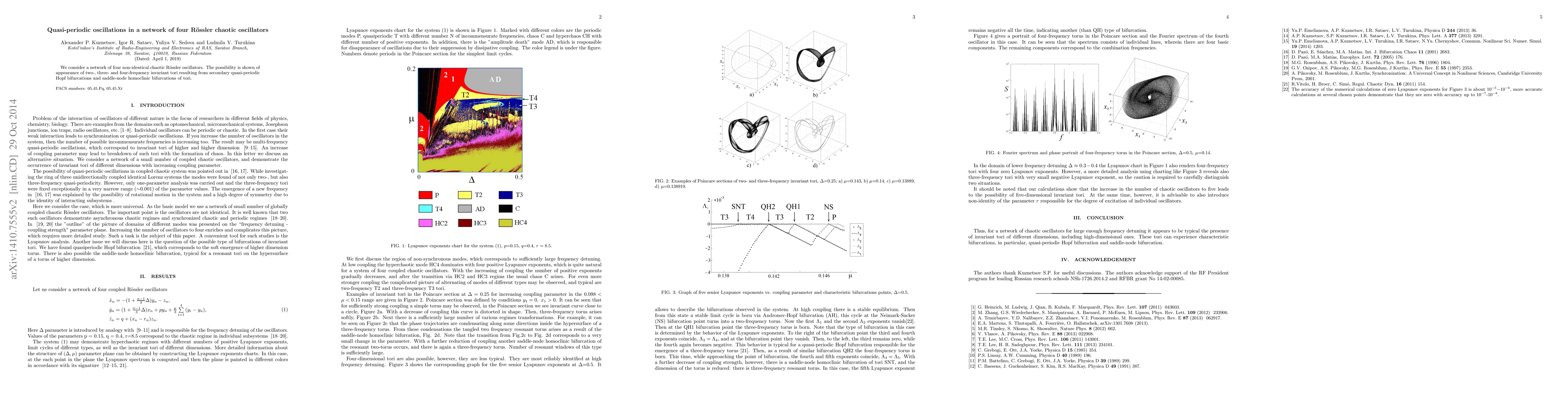 The paper explores a network of four distinct chaotic Rossler oscillators, demonstrating the emergence of two-, three-, and four-frequency invariant tori through secondary quasi-periodic Hopf bifurcations and saddle-node homoclinic bifurcations of tori.