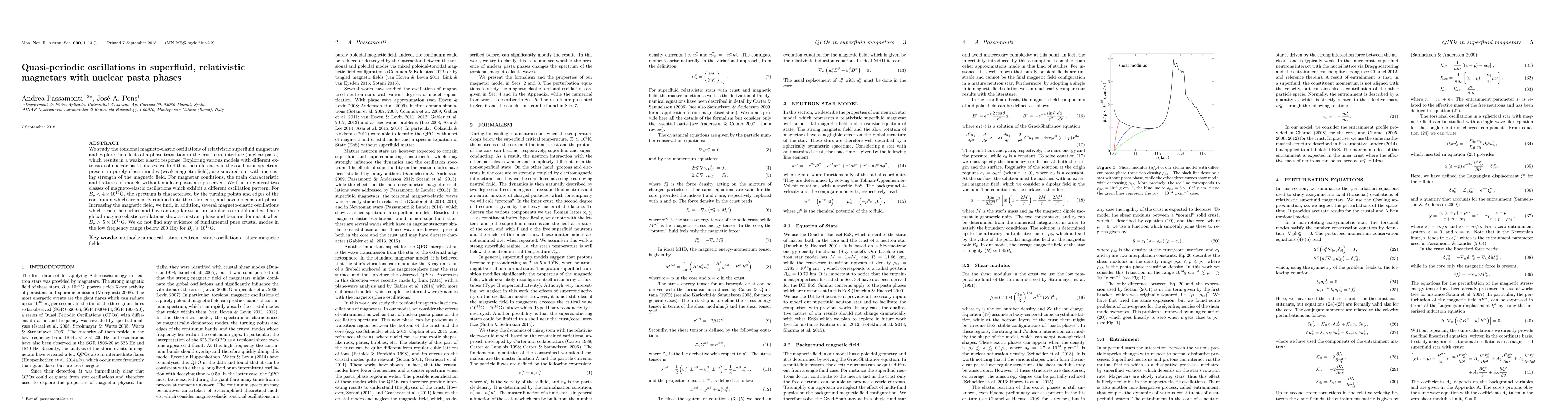 This paper investigates torsional magneto-elastic oscillations in relativistic superfluid magnetars, focusing on the impact of nuclear pasta phases at the crust-core interface. The study reveals that while nuclear pasta phases weaken the elastic response, the oscillation spectrum is dominated by global magneto-elastic oscillations with constant phase when the magnetic field exceeds 5 x 10^14 G.