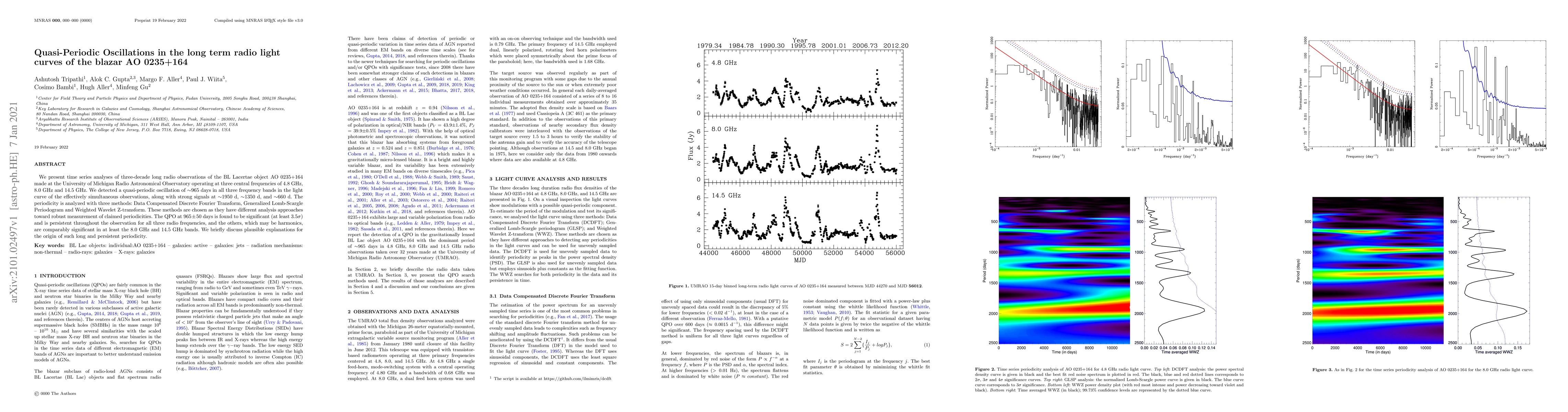 We present time series analyses of three-decade long radio observations of the BL Lacertae object AO 0235+164 made at the University of Michigan Radio Astronomical Observatory operating at three central frequencies of 4.8 GHz, 8.0 GHz and 14.5 GHz. We detected a quasi-periodic oscillation of $\sim$965 days in all three frequency bands in the light curve of the effectively simultaneous observations, along with strong signals at $\sim$1950 d, $\sim$1350 d, and $\sim$660 d. The periodicity is analyzed with three methods: Data Compensated Discrete Fourier Transform, Generalized Lomb-Scargle Periodogram and Weighted Wavelet Z-transform. These methods are chosen as they have different analysis approaches toward robust measurement of claimed periodicities. The QPO at $965\pm 50$ days is found to be significant (at least $3.5\sigma$) and is persistent throughout the observation for all three radio frequencies, and the others, which may be harmonics, are comparably significant in at least the 8.0 GHz and 14.5 GHz bands. We briefly discuss plausible explanations for the origin of such long and persistent periodicity.