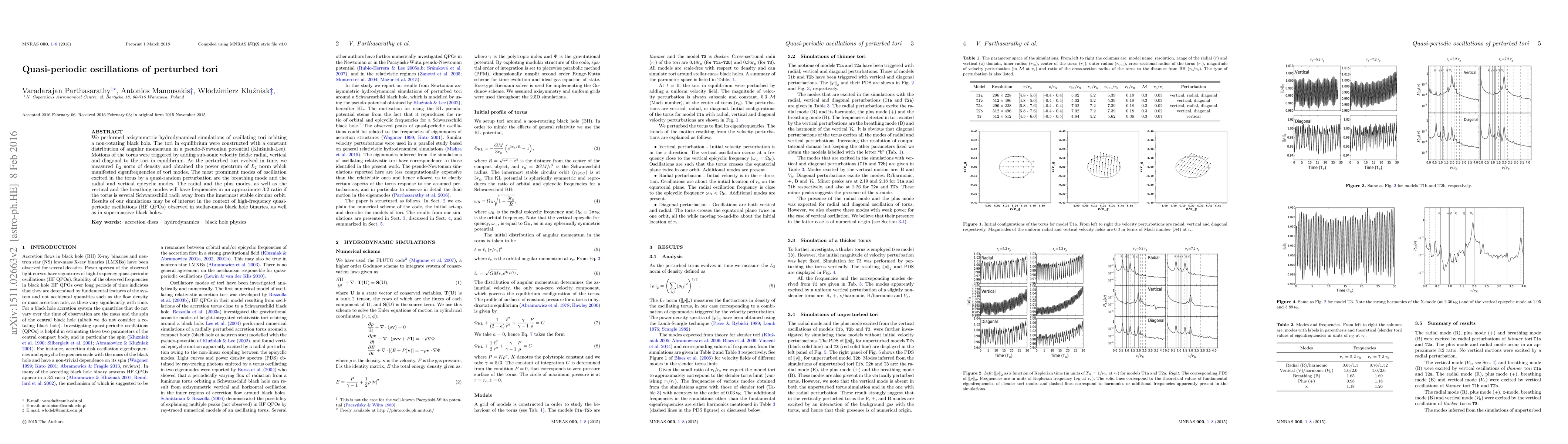 This study investigates the quasi-periodic oscillations of tori orbiting a non-rotating black hole through axisymmetric hydrodynamical simulations. The simulations reveal prominent oscillation modes, including the breathing mode and epicyclic modes, with frequency ratios that may explain high-frequency quasi-periodic oscillations observed in black hole binaries.