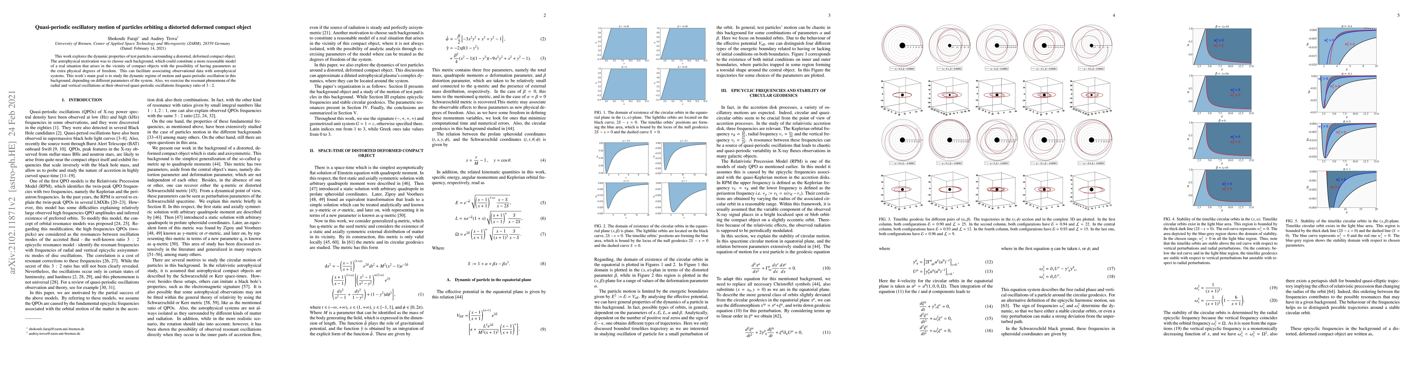 Researchers studied dynamic properties of particles orbiting a distorted compact object, finding quasi-periodic oscillations in radial and vertical motions with frequency ratios of 3:2.