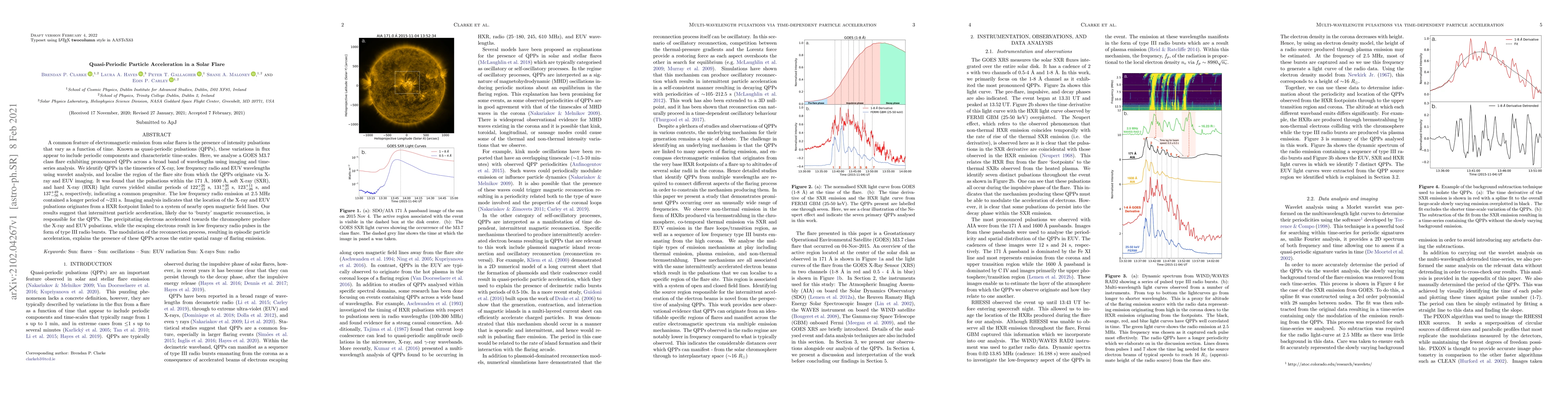 A common feature of electromagnetic emission from solar flares is the presence of intensity pulsations that vary as a function of time. Known as quasi-periodic pulsations (QPPs), these variations in flux appear to include periodic components and characteristic time-scales. Here, we analyse a GOES M3.7 class flare exhibiting pronounced QPPs across a broad band of wavelengths using imaging and time-series analysis. We identify QPPs in the timeseries of X-ray, low frequency radio and EUV wavelengths using wavelet analysis, and localise the region of the flare site from which the QPPs originate via X-ray and EUV imaging. It was found that the pulsations within the 171 \.A, 1600 \.A, soft X-ray (SXR), and hard X-ray (HXR) light curves yielded similar periods of $\sim$122 s, $\sim$131s, $\sim$123 s, and $\sim$137 s, respectively, indicating a common progenitor. The low frequency radio emission at 2.5 MHz contained a longer period of $\sim$231 s. Imaging analysis indicates that the location of the X-ray and EUV pulsations originates from a HXR footpoint linked to a system of nearby open magnetic field lines. Our results suggest that intermittent particle acceleration, likely due to 'bursty' magnetic reconnection, is responsible for the QPPs. The precipitating electrons accelerated towards the chromosphere produce the X-ray and EUV pulsations, while the escaping electrons result in low frequency radio pulses in the form of type III radio bursts. The modulation of the reconnection process, resulting in episodic particle acceleration, explains the presence of these QPPs across the entire spatial range of flaring emission.