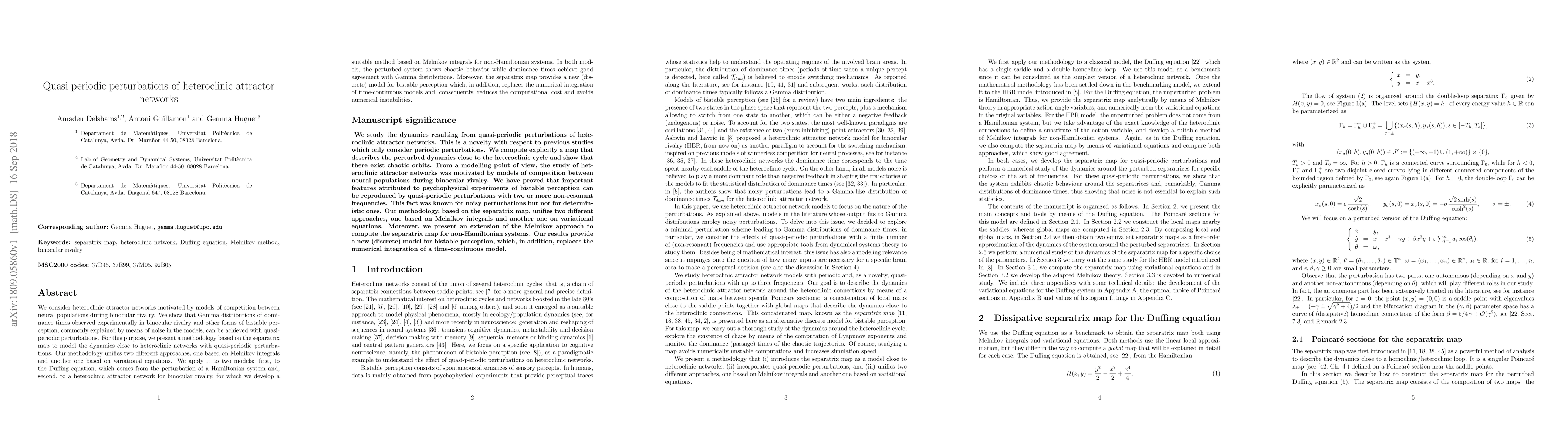 We consider heteroclinic attractor networks motivated by models of competition between neural populations during binocular rivalry. We show that Gamma distributions of dominance times observed experimentally in binocular rivalry and other forms of bistable perception, commonly explained by means of noise in the models, can be achieved with quasi-periodic perturbations. For this purpose, we present a methodology based on the separatrix map to model the dynamics close to heteroclinic networks with quasi-periodic perturbations. Our methodology unifies two different approaches, one based on Melnikov integrals and another one based on variational equations. We apply it to two models: first, to the Duffing equation, which comes from the perturbation of a Hamiltonian system and, second, to a heteroclinic attractor network for binocular rivalry, for which we develop a suitable method based on Melnikov integrals for non-Hamiltonian systems. In both models, the perturbed system shows chaotic behavior while dominance times achieve good agreement with Gamma distributions. Moreover, the separatrix map provides a new (discrete) model for bistable perception which, in addition, replaces the numerical integration of time-continuous models and, consequently, reduces the computational cost and avoids numerical instabilities.