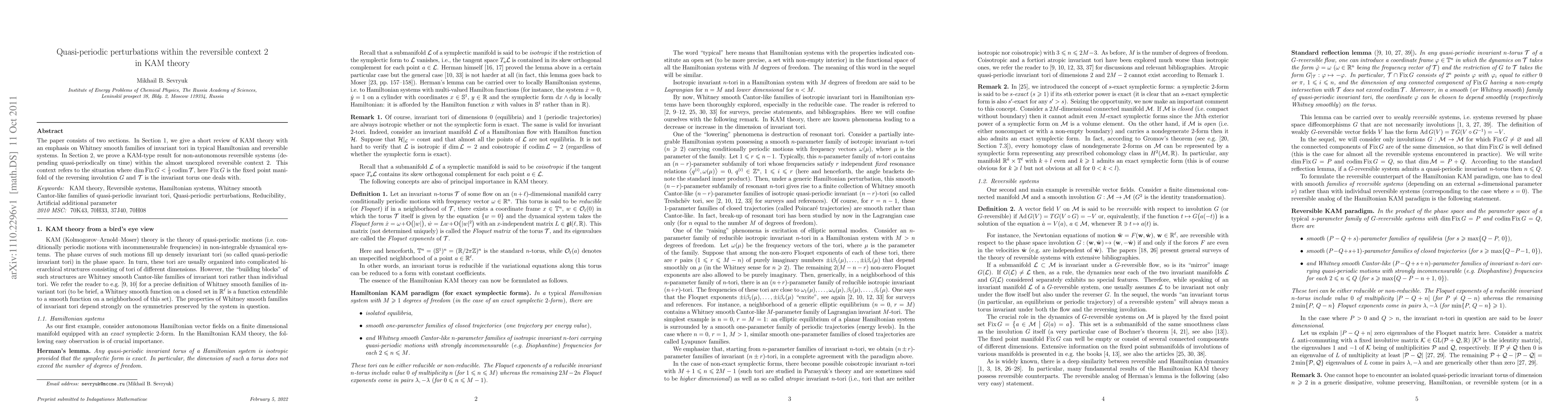 The paper consists of two sections. In Section 1, we give a short review of KAM theory with an emphasis on Whitney smooth families of invariant tori in typical Hamiltonian and reversible systems. In Section 2, we prove a KAM-type result for non-autonomous reversible systems (depending quasi-periodically on time) within the almost unexplored reversible context 2. This context refers to the situation where dim Fix G < (1/2) codim T, here Fix G is the fixed point manifold of the reversing involution G and T is the invariant torus one deals with.
