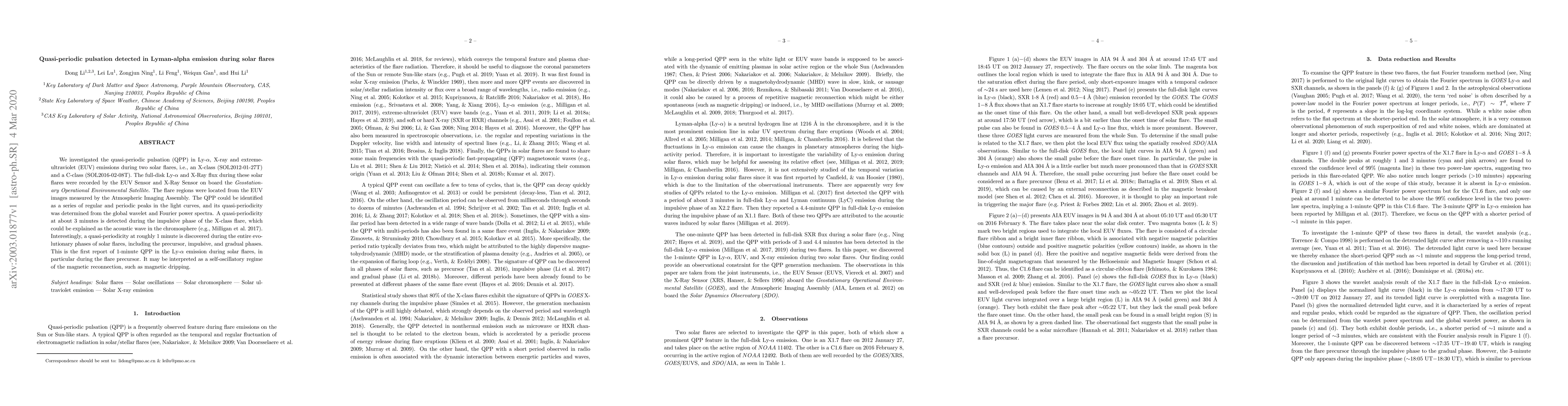 This study detected quasi-periodic pulsations (QPP) in Lyman-alpha emissions during solar flares, with a notable 1-minute QPP observed throughout all flare phases, suggesting a self-oscillatory regime of magnetic reconnection. A 3-minute QPP was also identified during the impulsive phase of an X-class flare, likely due to chromospheric acoustic waves.